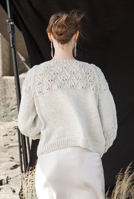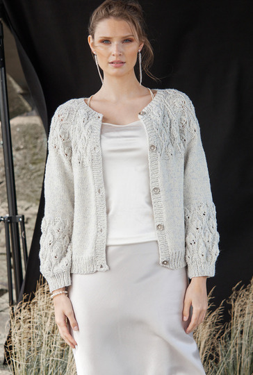 Diese Jacke aus reiner Schurwolle erhält durch das beilaufende Lurexgarn einen zarten Glanzeffekt. Uns gefielen perlmuttschimmernde Knöpfe dazu an besten. Das plastische Blattmuster mit kleinen Löchern betont die Passe rundum, auch an den Raglanärmeln; hier auch noch direkt nach dem Bund. Die Raglans sind einfach zu stricken, da sie keine Abnahmen für die Halsausschnittrundungen haben, sondern ganz gerade enden. Alle Bündchen und die Knopflochblende sind im 1/1-Rippenmuster gearbeitet. Die Anleitung dazu steht zum Download bereit für die Größen 38/40 und 44/46.