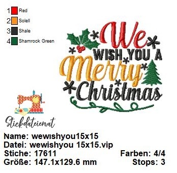 Der Schriftzug "We Wish You A Merry Christmas" ist eine bekannte Zeile aus einem beliebten Weihnachtslied und drückt den Wunsch nach fröhlichen Feiertagen aus. Die begleitenden weihnachtlichen Motive, wie ein Tannenbaum, Schnörksel und Schneeflocken, fangen die festliche Atmosphäre der Saison ein.