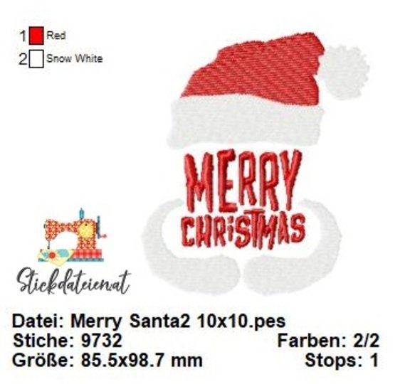 Unsere Stickdatei mit dem Schriftzug "Merry Christmas," der sich zusammen mit einer Mütze und einem Bart zu einem fröhlichen Weihnachtsmann-Gesicht formt, ist wie ein lachender Weihnachtsgruß zum Fest!