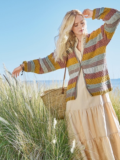 Diese tolle Jacke ist Strickprofis vorbehalten, denn sie ist durch ihre Vielzahl an unterschiedlichen Mustern nicht nur anspruchsvoll, sondern erfordert auch etwas Geduld. So entsteht Streifen für Streifen ein Highlight in Sachen Strick, zu der auch die Farbkomposition aus warmen Braun-, Curry- und Naturtönen beiträgt. Das Ganzjahresgarn aus Baumwolle und Viskose ist weich und anschmiegsam, lässt alle Strukturen toll zur Geltung kommen und setzt sich bis weit in den Herbst hinein in Szene. Umhäkelte Kanten und die Knopfleiste bilden das Finish.