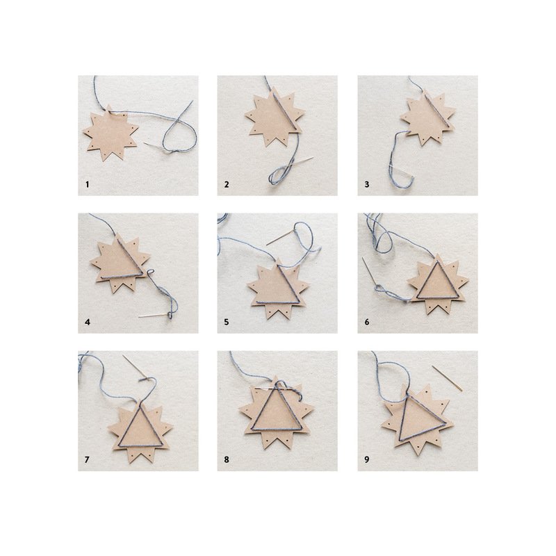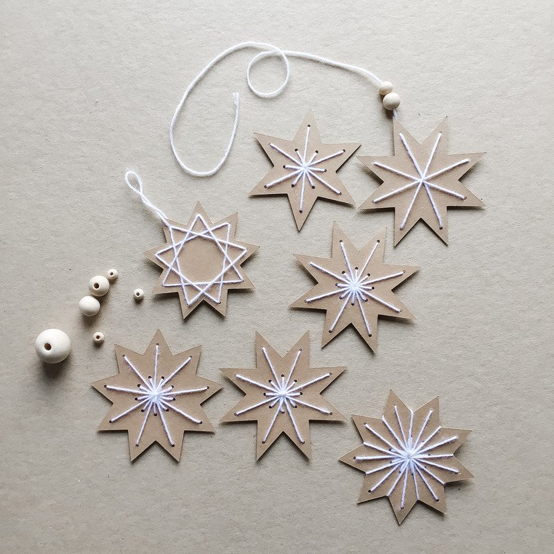 Als Material eignet sich festes Papier (z.B. Aquarellkarton oder Fotokarton). Dazu brauchst du Wollreste, Stickgarn oder Juteschnur und eine Stopfnadel und Schere. Wenn du magst kannst du die Sterne mit einer Schnur aufhängen und noch mit kleinen (Holz-)Perlen oder ähnliches verzieren. Da kannst du einfach ausprobieren, was dir am besten gefällt.