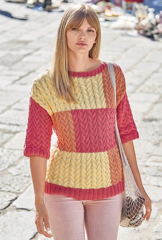 Patchworkoptik in heiteren Tönen – das ist genau das Richtige für die ersten Frühlingsgefühle. Hier als Farbflächenpulli aus weichem Baumwoll-Synthetikgarn, das die dreidimensionalen Strukturen des Zopfmuster so richtig plastisch zur Geltung kommen lässt. Die farbigen Rechtecke werden übrigens in Intarsientechnik gearbeitet. Das heißt, du musst beim Wechsel der Farben die Fäden immer auf der Arbeitsrückseite verkreuzen, so vermeidest du am Übergang unsaubere Löcher. Der gerade Schnitt, leichte Schulterschrägungen und der flache Halsausschnitt stehen für pures Understatement.