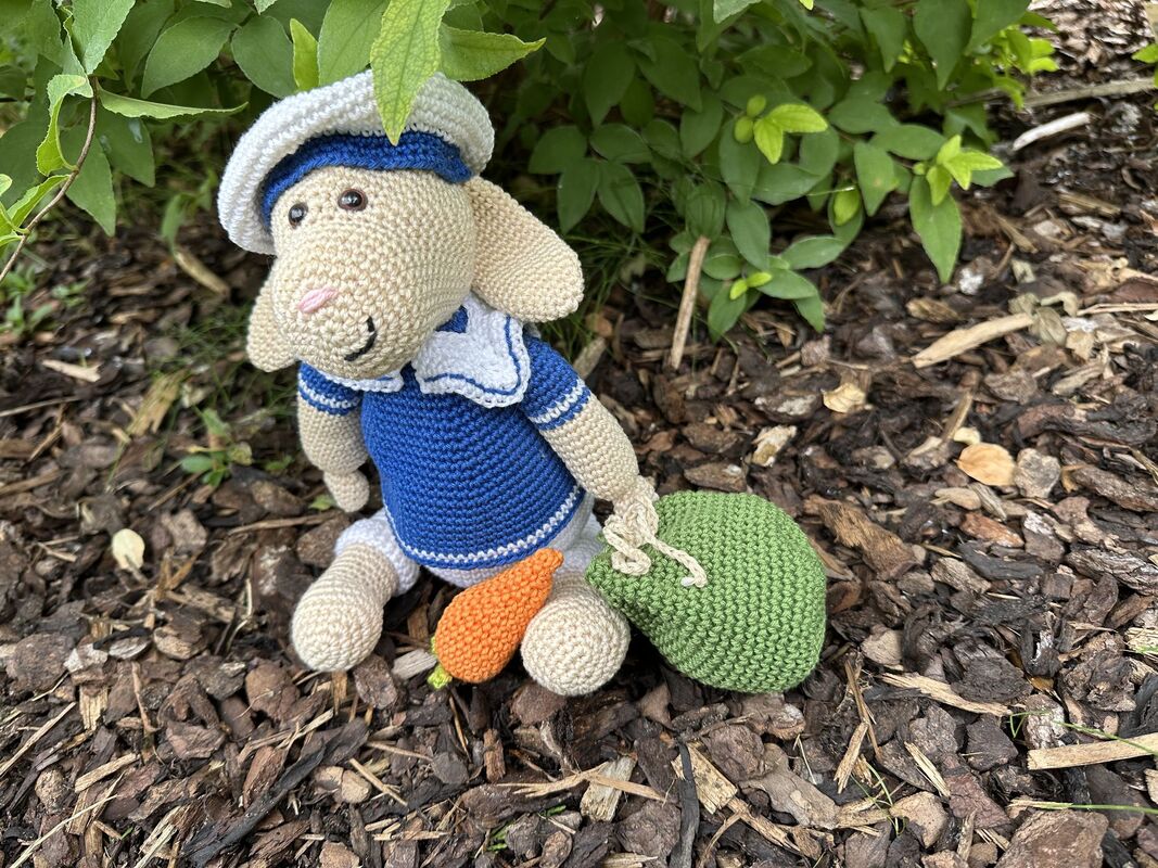 Hanno Hase wird, unter Verwendung des angegebenen Materials, 20 cm groß. Die Anleitung für die Karotte und den Seesack sind natürlich auch dabei.