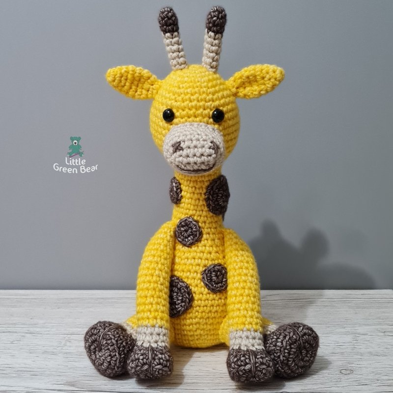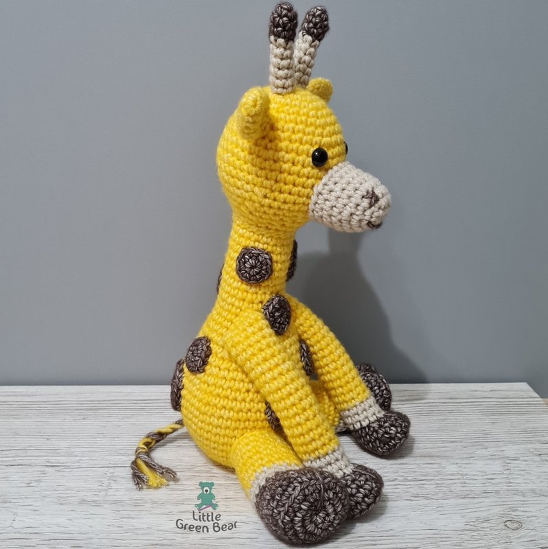 Geoff, the curious little giraffe, needs very little sleep. He loves to spend his days grazing on plants and shoots and occasionally getting into mischief! He sits just over 12 inches tall (when made with the recommended materials).