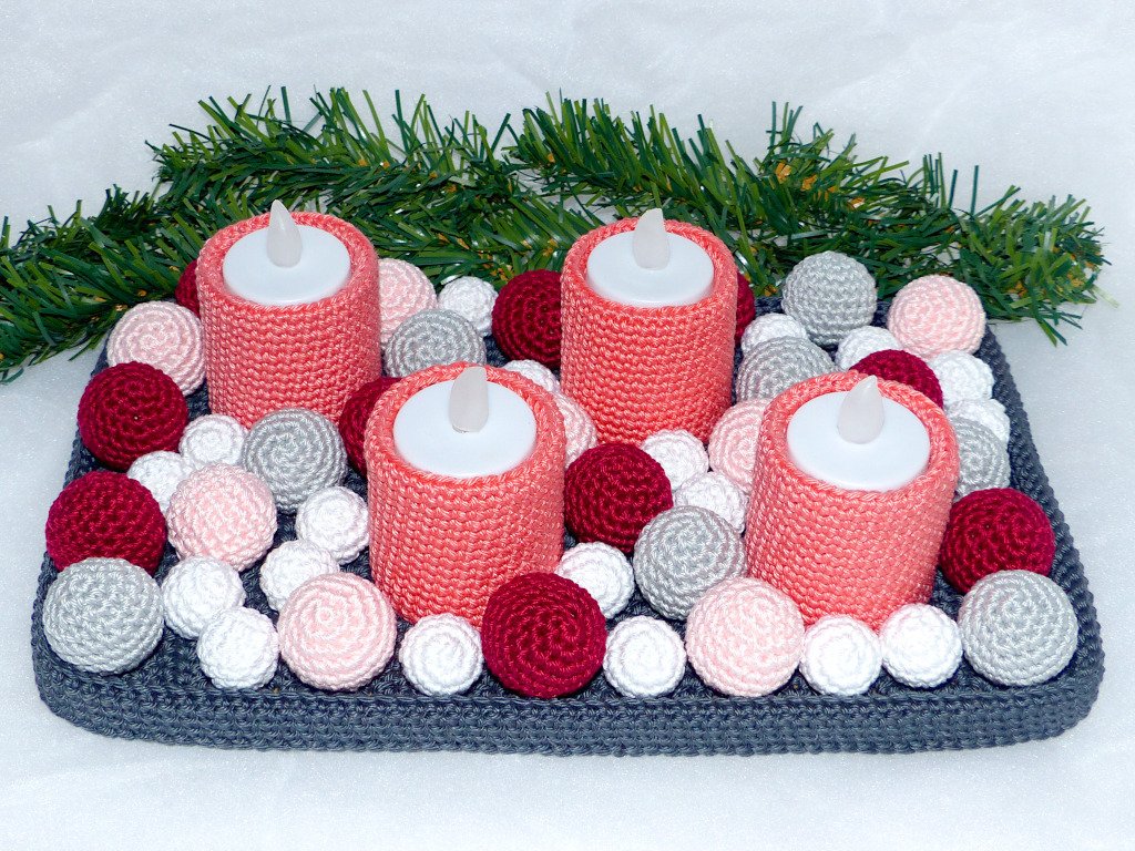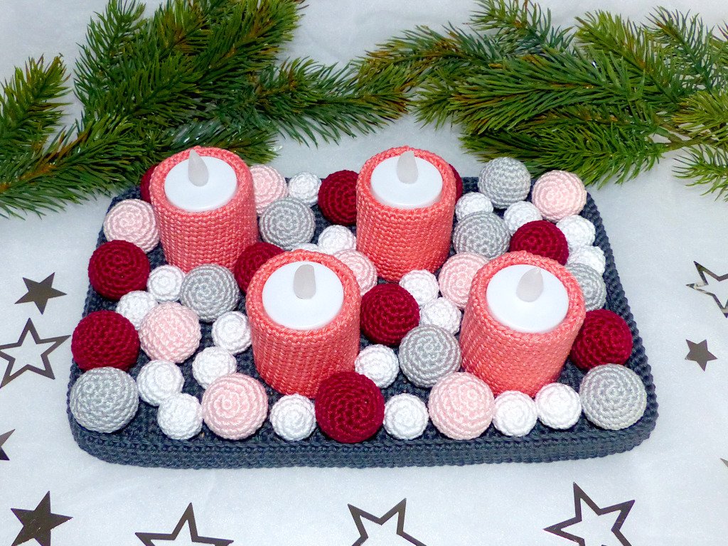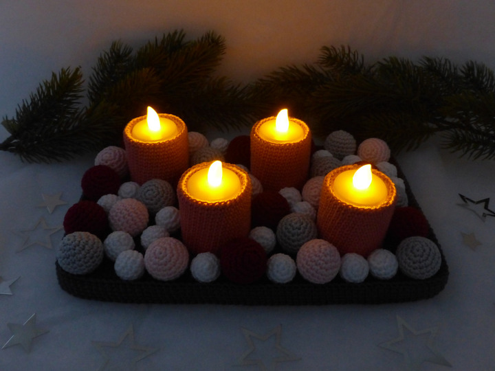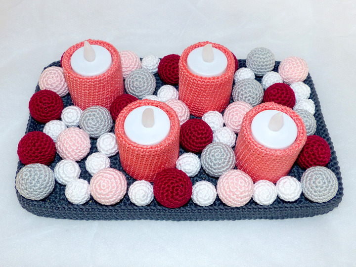 Ich beschreibe euch in der Anleitung wie die Grundplatte, die Kugeln in 2 verschiedenen Größen und die Teelichthalter gehäkelt werden.