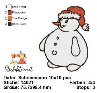 Unsere bezaubernde Stickdatei mit einem Schneemann, der eine festliche Weihnachtsmütze trägt, ist wie ein lächelnder Botschafter des Winterzaubers! ️️