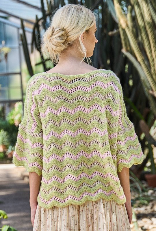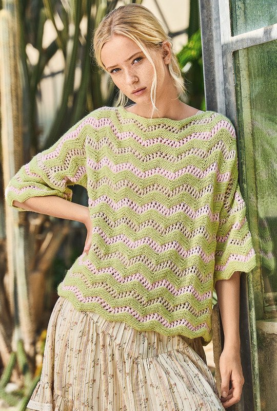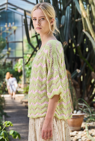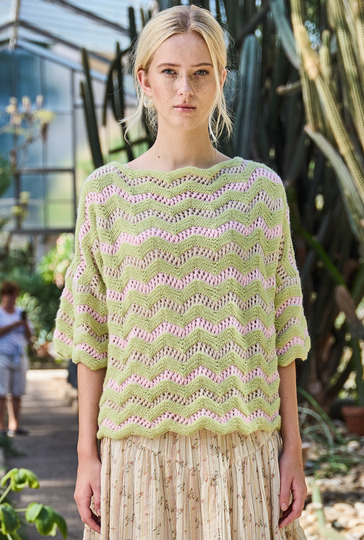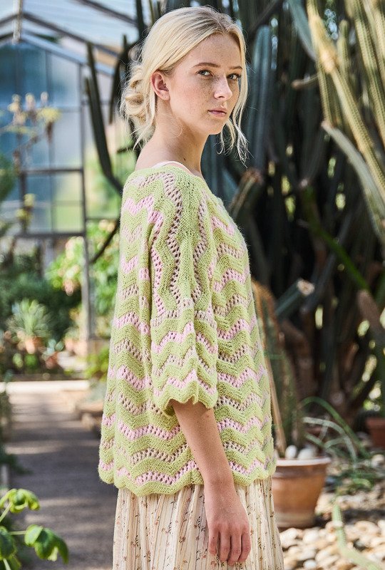 Zartes Grün, helles Rosa und neutrales Beige sind die Farbprotagonisten dieses lässigen Pullis. Alle zusammen werden in gleichmäßigem Streifendesign zu einem Zackenmuster mit Ajourstreifen kombiniert und sorgen beim Stricken und Tragen für gute Laune. Leicht überschnittene Schultern, ein gerader Turtleneck und halblange Ärmel sind kein Hexenwerk und kommen ganz ohne Blenden aus. Ein toller Begleiter für den Übergang, denn das leicht aufgeraute Baumwollgarn mit Alpaka und Schurwolle macht das ganze Jahr über Freude.