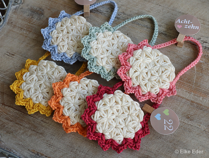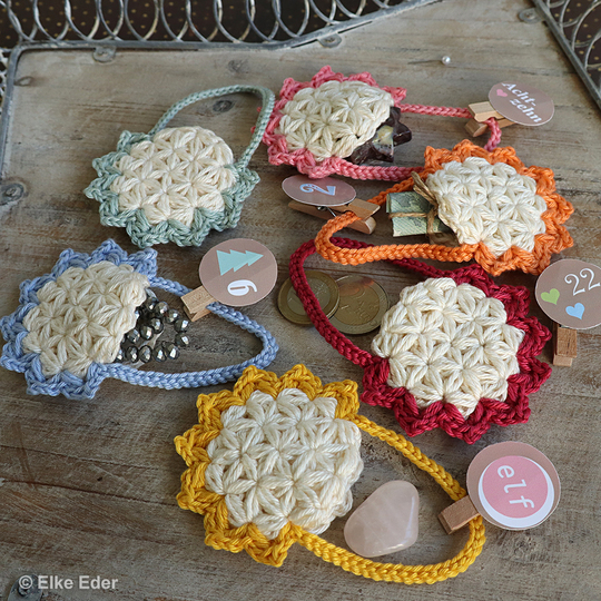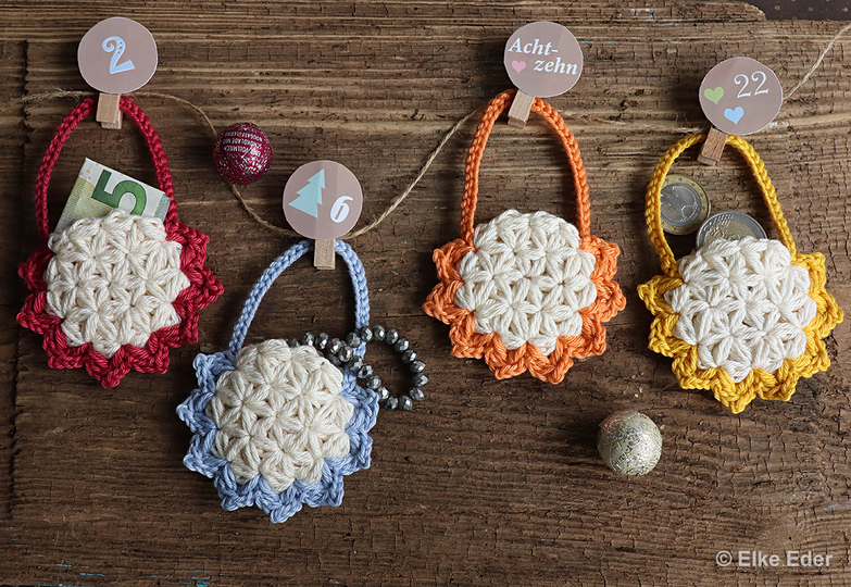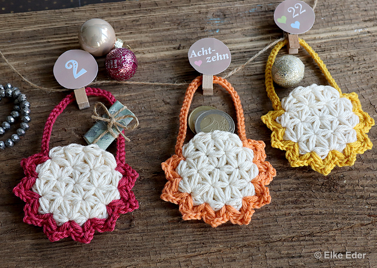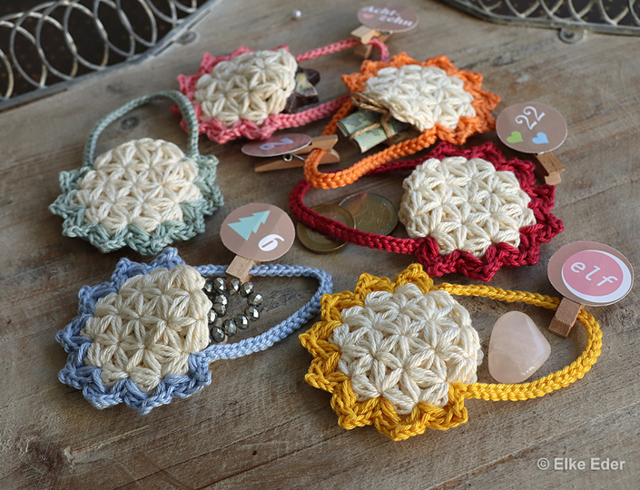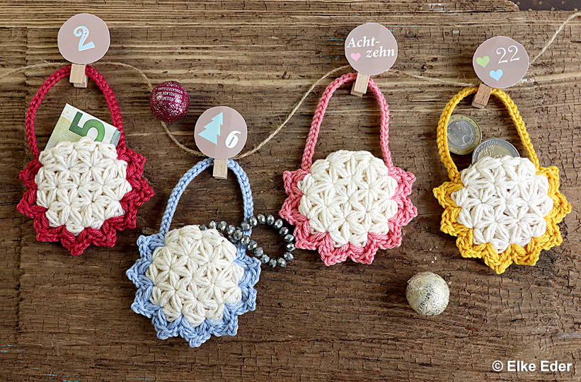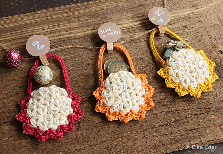 Die süßen kleinen Sterntäschchen sind schnell gehäkelt und sind perfekt um kleine Überraschungen für die Liebsten zu verbergen, z. B. Schmuckstücke, schöne Steine, Gutscheine, Geldgeschenke etc.