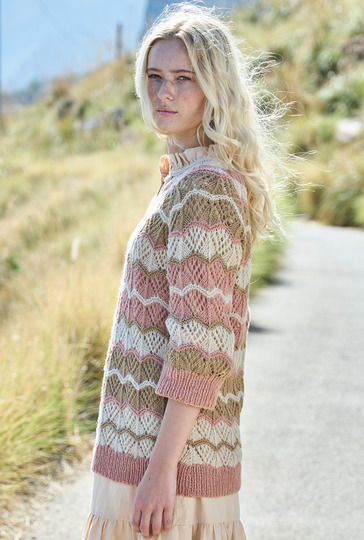 Wellenstrukturen sind einfach zu stricken und erzielen durch den raffinierten Einsatz unterschiedlicher Farbstreifen einen ganz individuellen Look. Hier sind es Rosa, Braun und Beige, die sich zur einem harmonischen Mix zusammentun und einen tollen Raglanpulli entstehen lassen, den es nicht von der Stange zu kaufen gibt. Das weiche Garn, das durch einen ganz zarten Flausch heraussticht, besteht hauptsächlich aus Baumwolle, zu der sich Alpaka, Seide und Schurwolle gesellen – ein spannende Mischung, die auch im Herbst Tragekomfort garantiert.