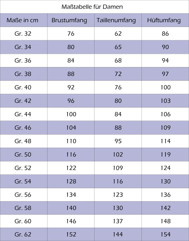Im Schnittmuster enthalten sind die Damengrößen 32 - 62.