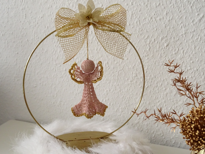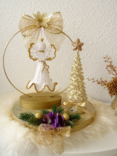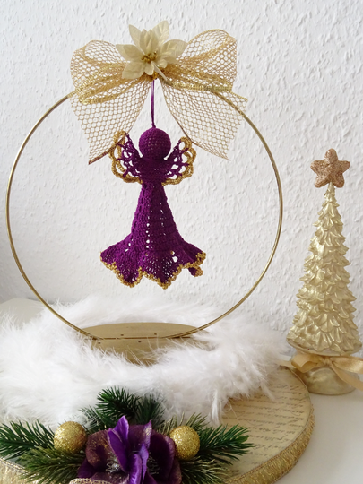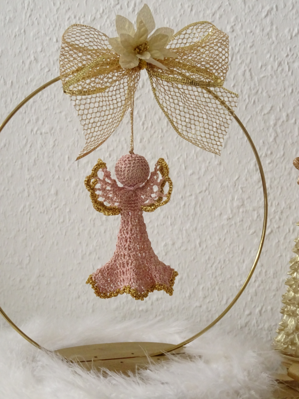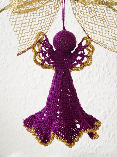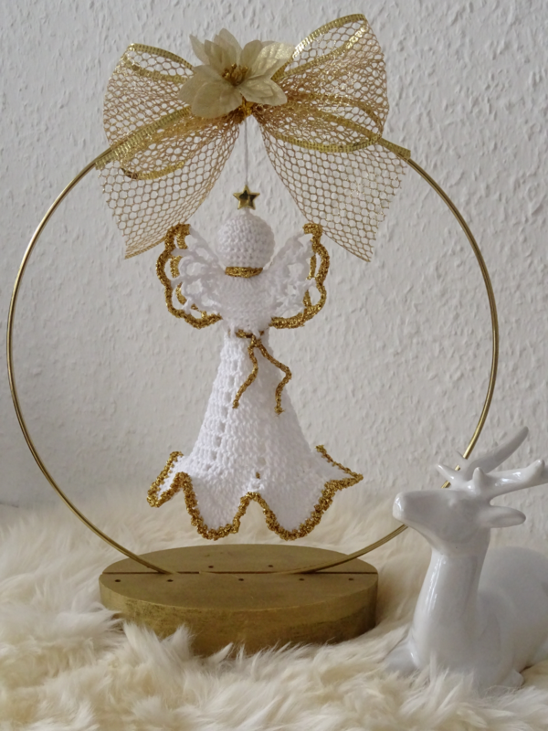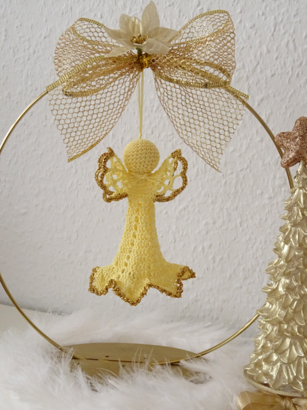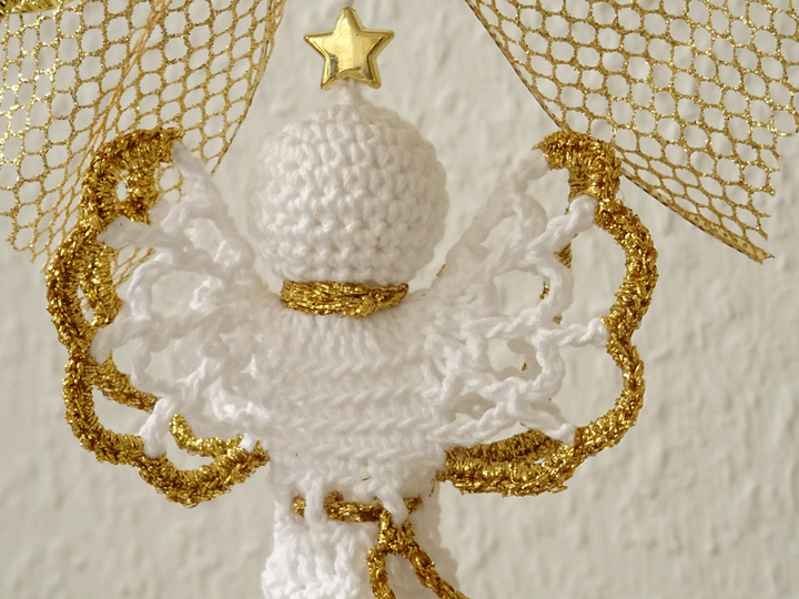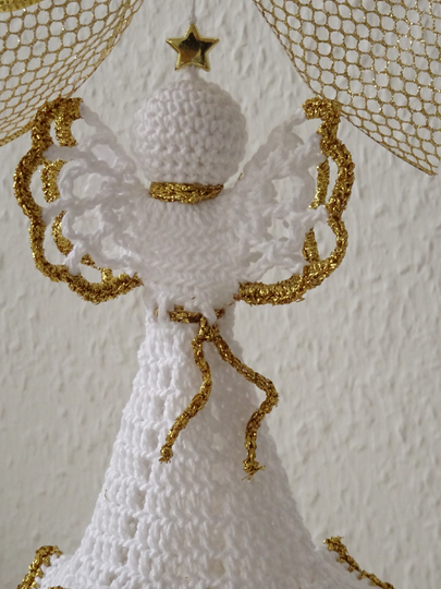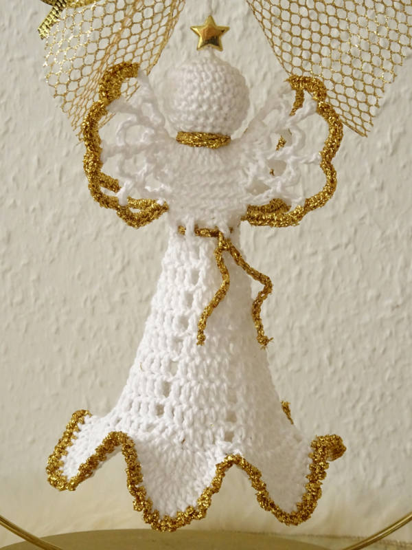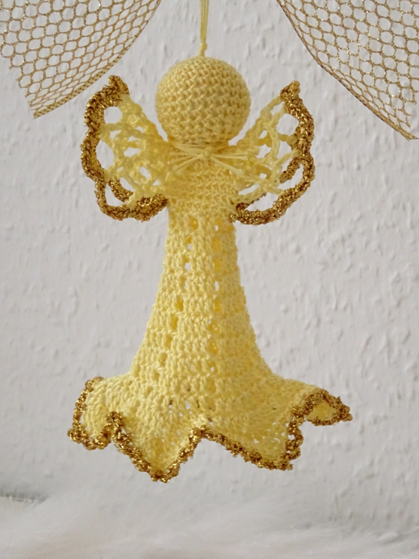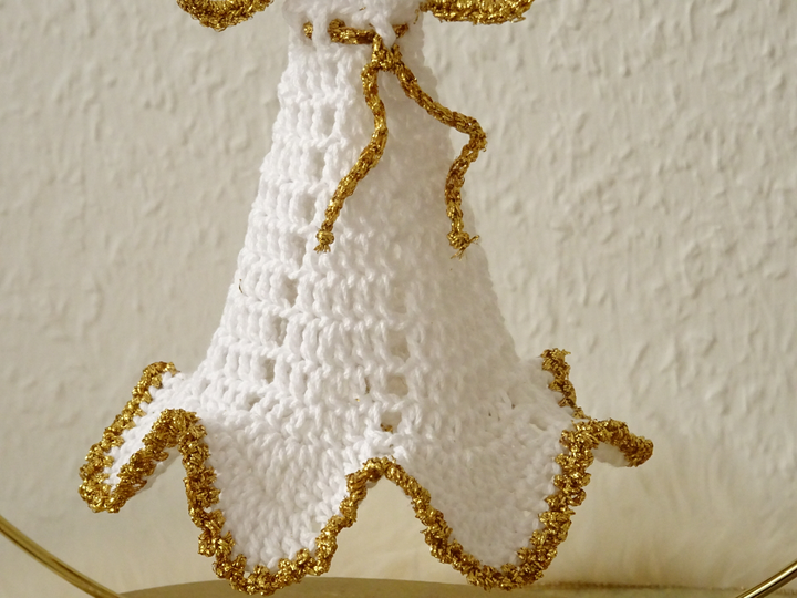 Der Engel wird in 2 separaten Arbeitsschritten, Körper und Kopf, beginnend mit dem Körper von oben nach unten gearbeitet. Die Abschlusskanten der Flügel und des Röckchens werden mit Effektgarn in gold umhäkelt. Der Kopf ist optional mit einer Aufhängung versehen. Nach Fertigstellung von Körper und Kopf werden beide Teile miteinander vernäht.