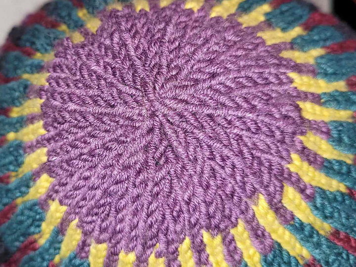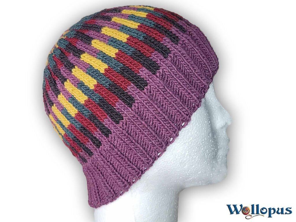Wer noch nie ein Jacquardmuster gestrickt hat, kann sich an dieser einfachen aber effektvollen Mütze versuchen. Es sind 5 Farben die sich abwechseln und immer 2 Maschen in der einen Farbe und mal in der anderen. So kann man prima diese Technik üben und strickt am Ende mit 2 Fäden genauso schnell wie mit einem.