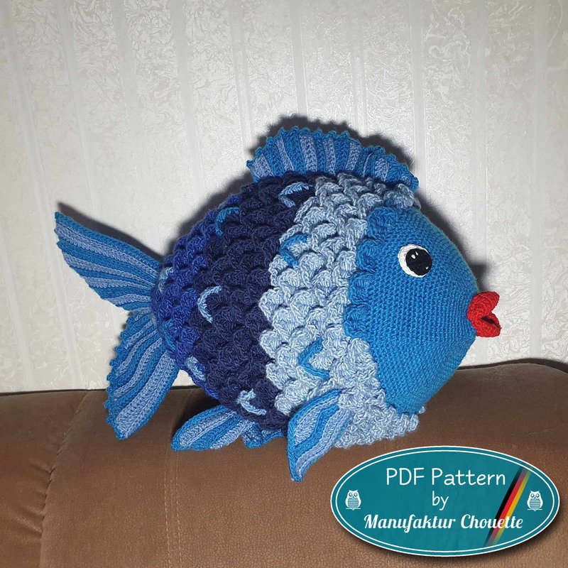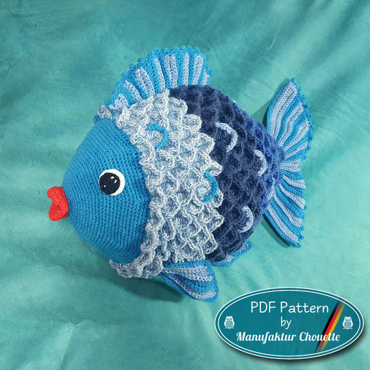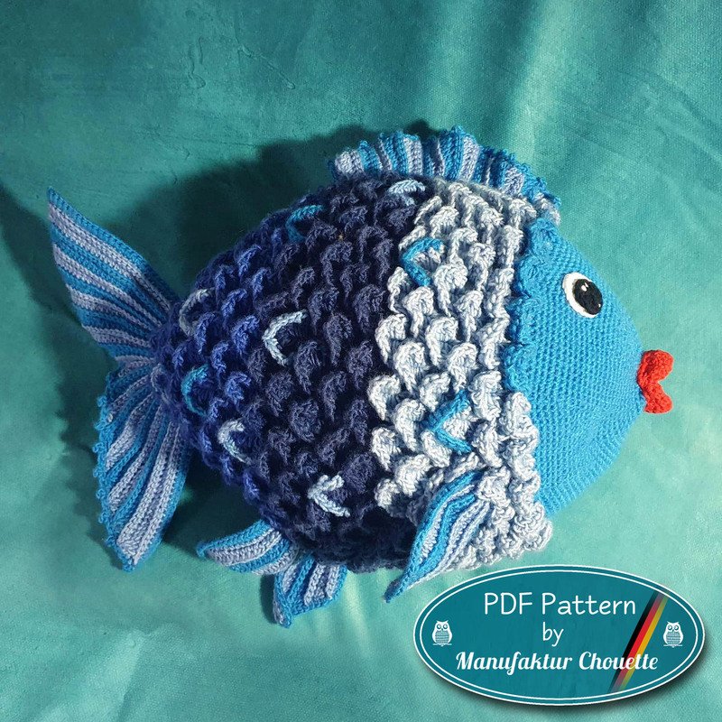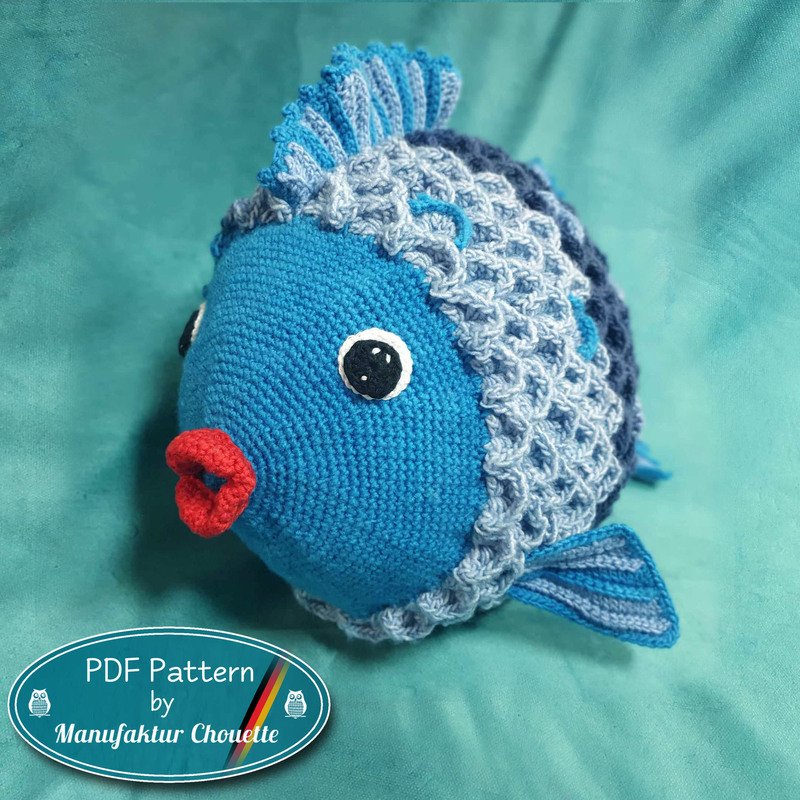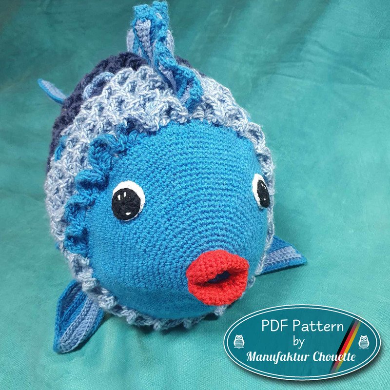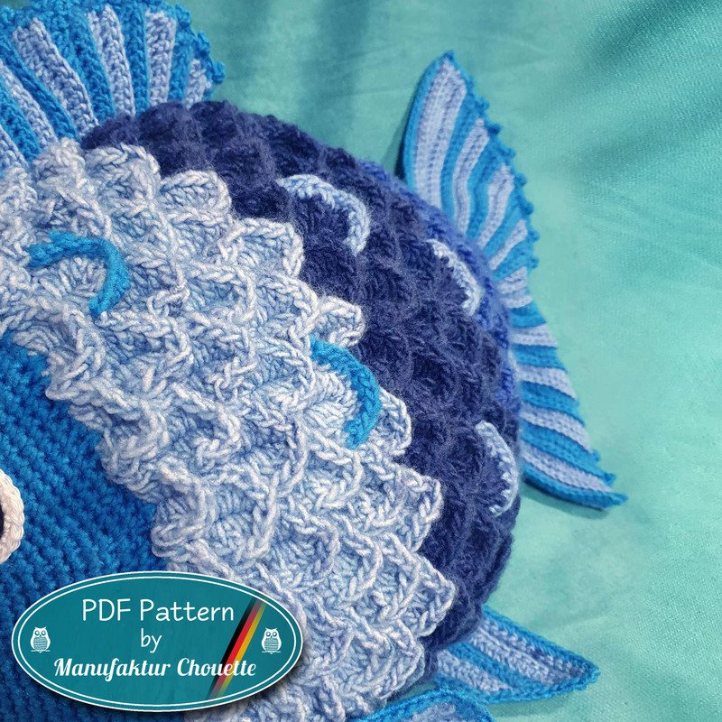 Noch ein Kissenfisch. Im Gegensatz zu Willie, dem bunten Kissenfisch wird Eddy aus Cakes bzw. Bobbelgarn gehäkelt. Anderes Garn in entsprechender Lauflänge ist auch möglich. Du kannst selbst bestimmen, wie bunt Dein Fisch werden soll.