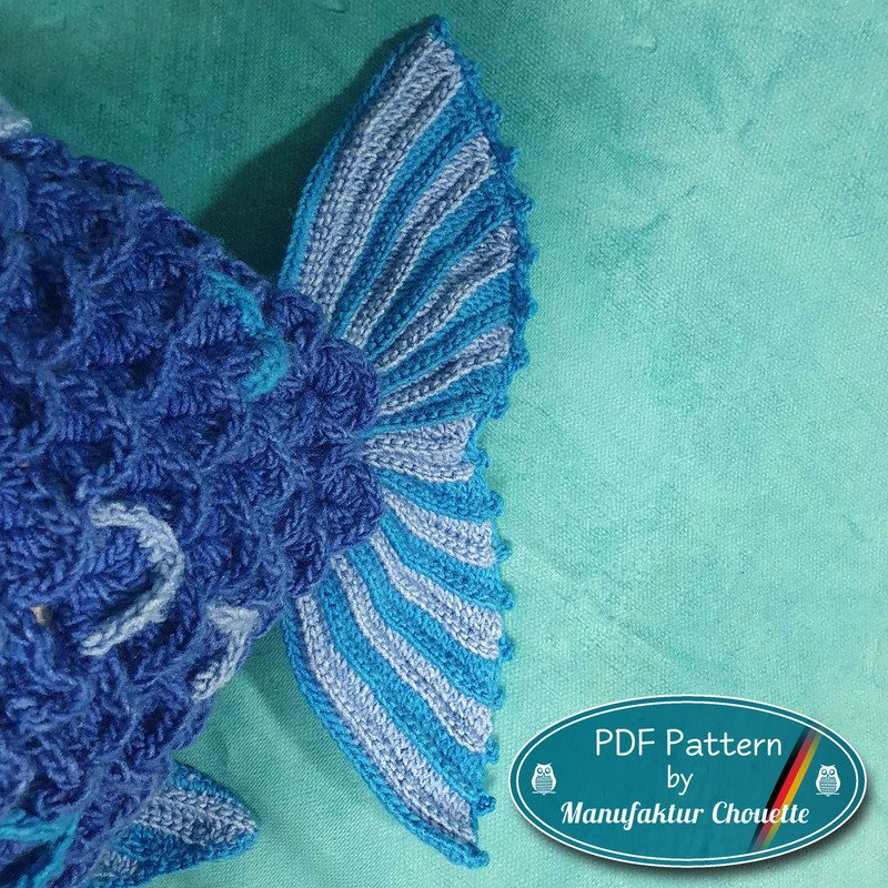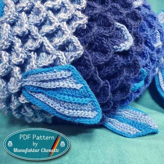 Du benötigst 2 Cakes à 200g (oder 1000m Bobbel) mit Farbverlauf Deiner Wahl als Grundfarben, Reste von Rot, weiß und Schwarz für Mund undAugen und ggf. Garn in versch. Farben für bunte Schuppen und Flossen. Eine ausführliche Materialliste ist in der Anleitung.