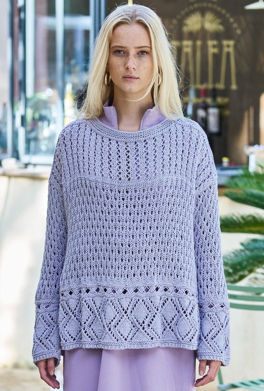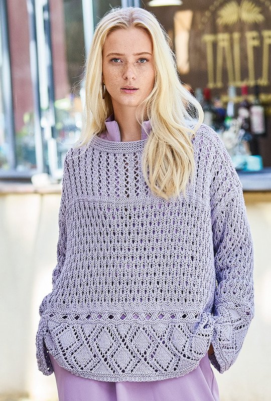 Rautenstrukturen, Fallmaschenmuster und Ajourrippen: Kreative Strickfans kommen bei diesem lässigen Pulli in zartem Fliederlila voll auf ihre Kosten, denn der Mix aus sechs verschiedenen Mustern erzeugt die spannende Optik, die aber auch etwas anspruchsvoller in der Machart ist. Dafür ist die Schnittform mit eckigem Halsausschnitt und gerade eingesetzten Ärmeln um so einfacher. Aus organischer Baumwolle ein Stück fürs Leben, das es nicht von der Stange zu kaufen gibt.
