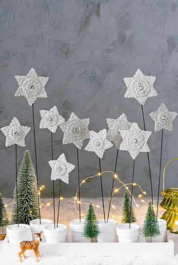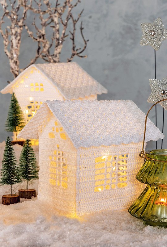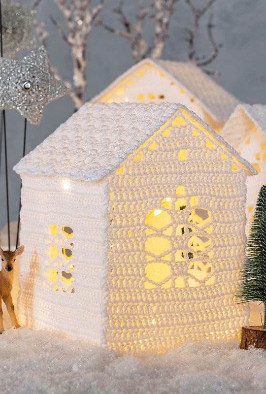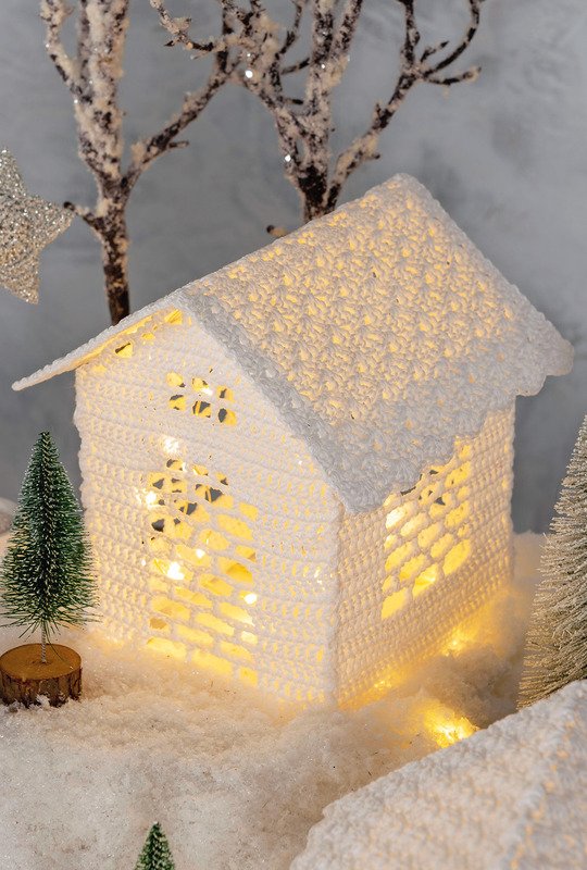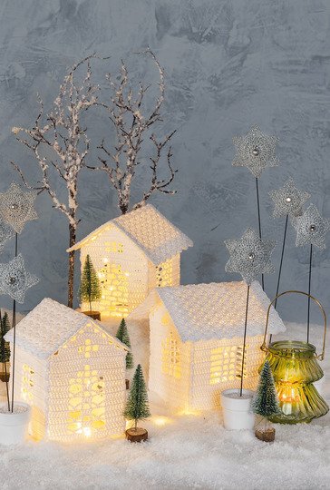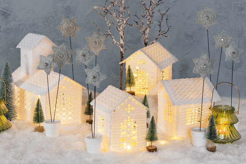 Tief eingeschneit zeigt sich dieses gehäkelte Winterdorf als Tischdeko in der kalten Jahreszeit, deren Häuser von innen beleuchtet werden können. So kommen die filigranen Muster besonders gut zur Geltung. Kleine silberne Sterne ergänzen das Ensemble.
