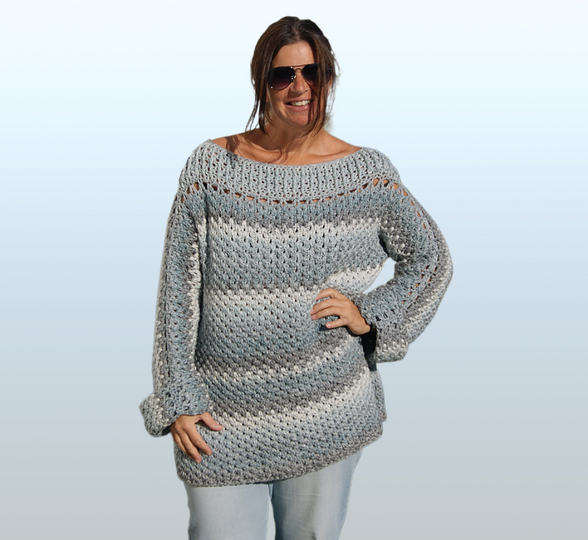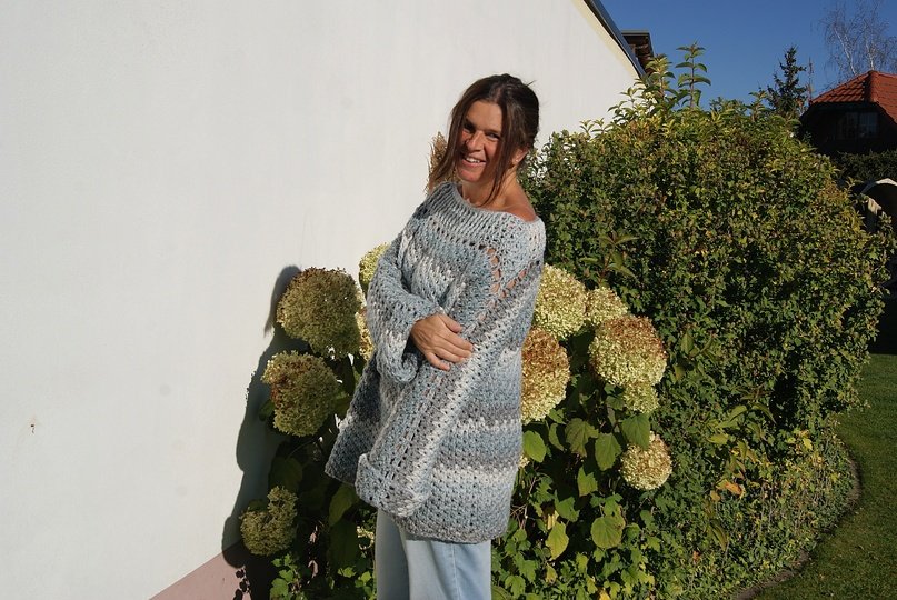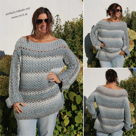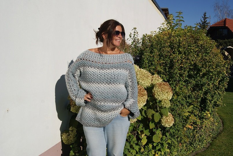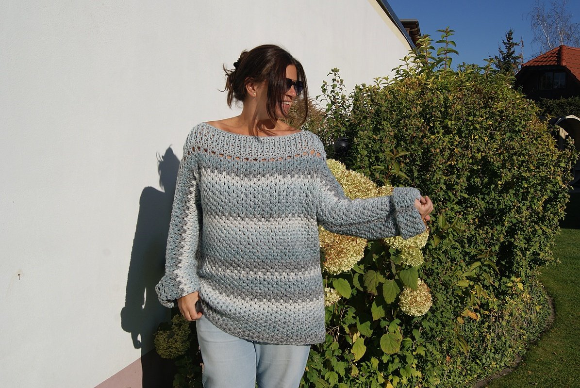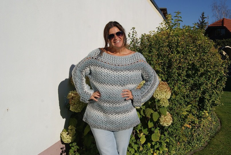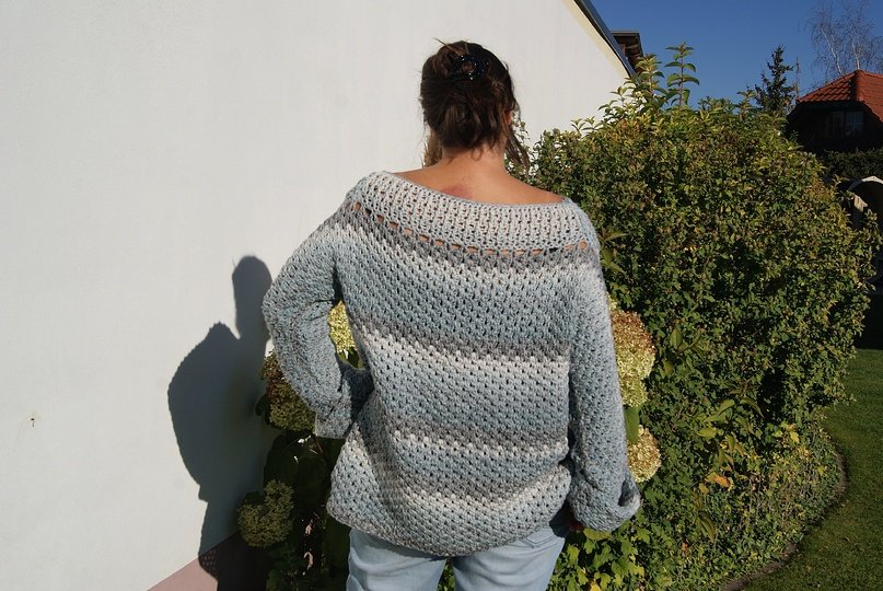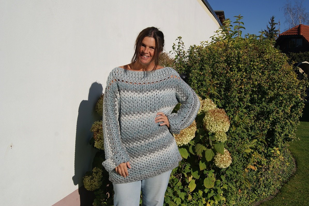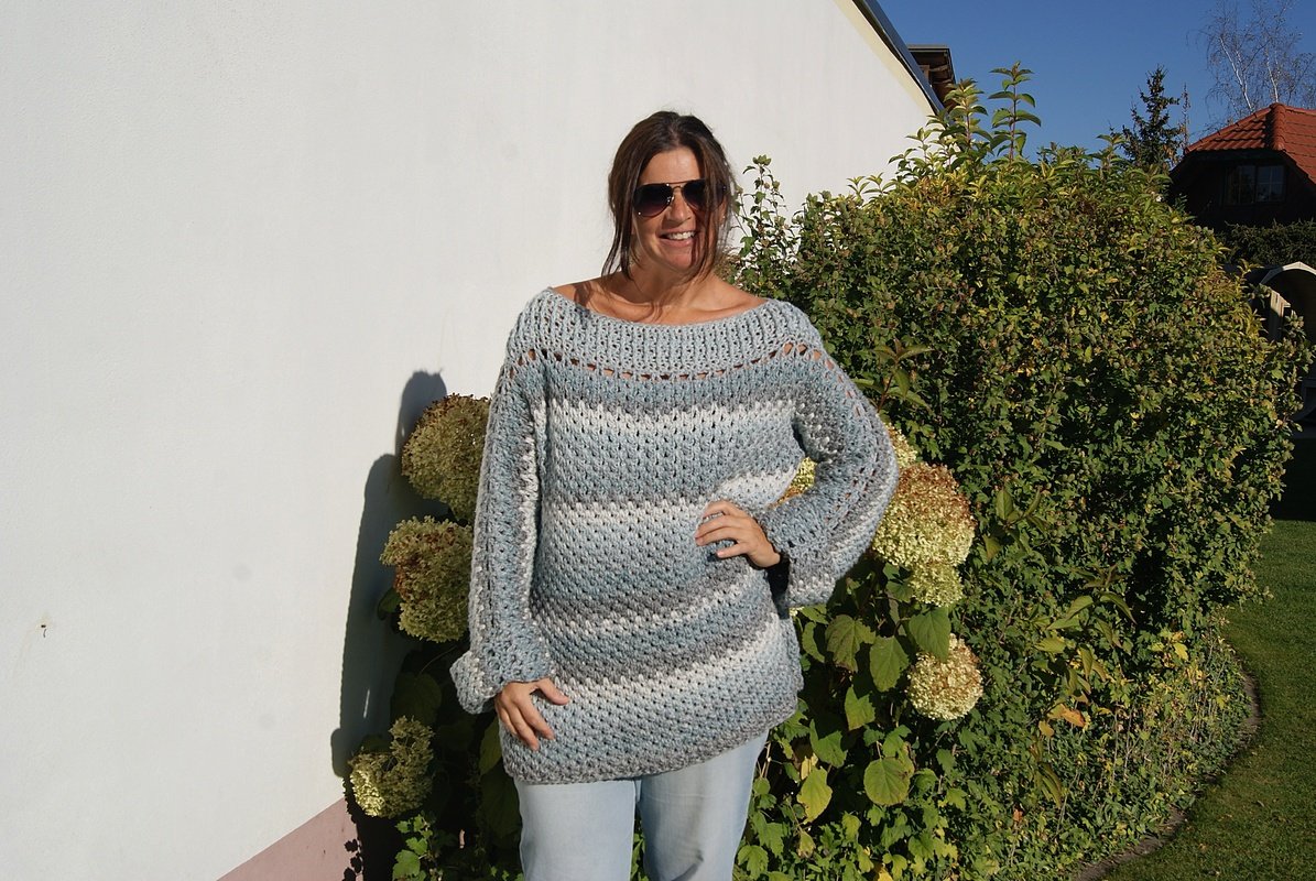 Die Anleitung ist einfach Schritt für Schritt mit Skizzen, Maßen und vielen Fotos erklärt. Auch die Häkelschriften sind darunter jeweils genau Reihe für Reihe bzw. Runde für Runde in Worten niedergeschrieben. Der Pulli ist ganz leicht für alle Größen anzupassen.