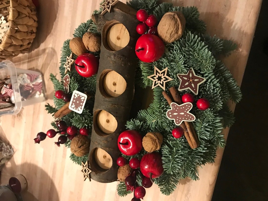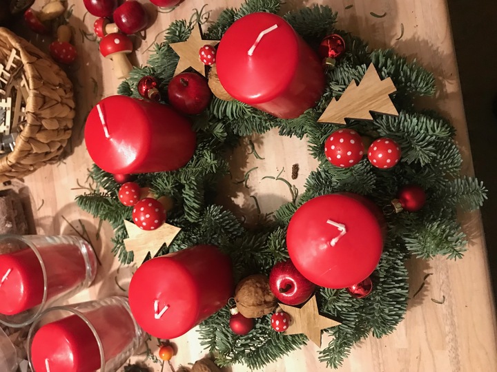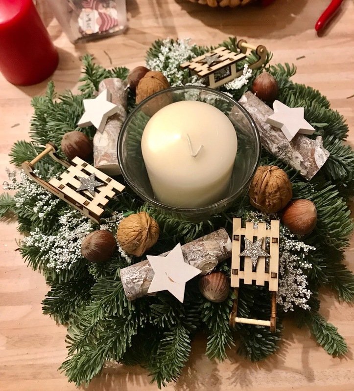 Wickeldraht, Strohrömer, Tanne, Kerzen, Dekorationsmaterial.