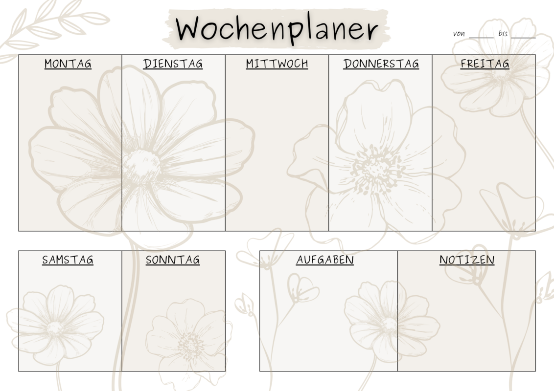 Dieser schöne Wochenplaner im Blumen-Design hilft Dir beim Planen und Organisieren Deiner wöchentlichen Termine. Notiere alles Wichtige in Deinem Wochenplan, um nichts mehr zu vergessen!