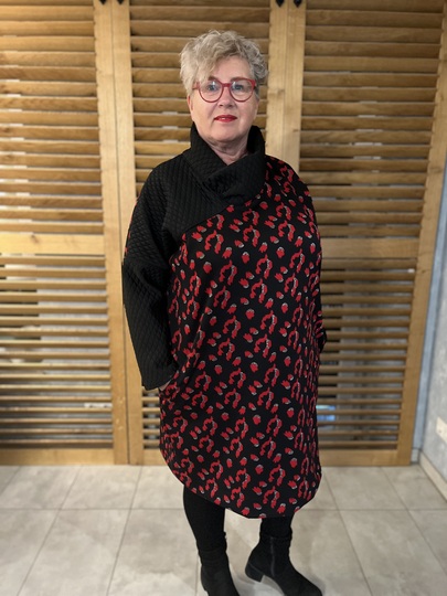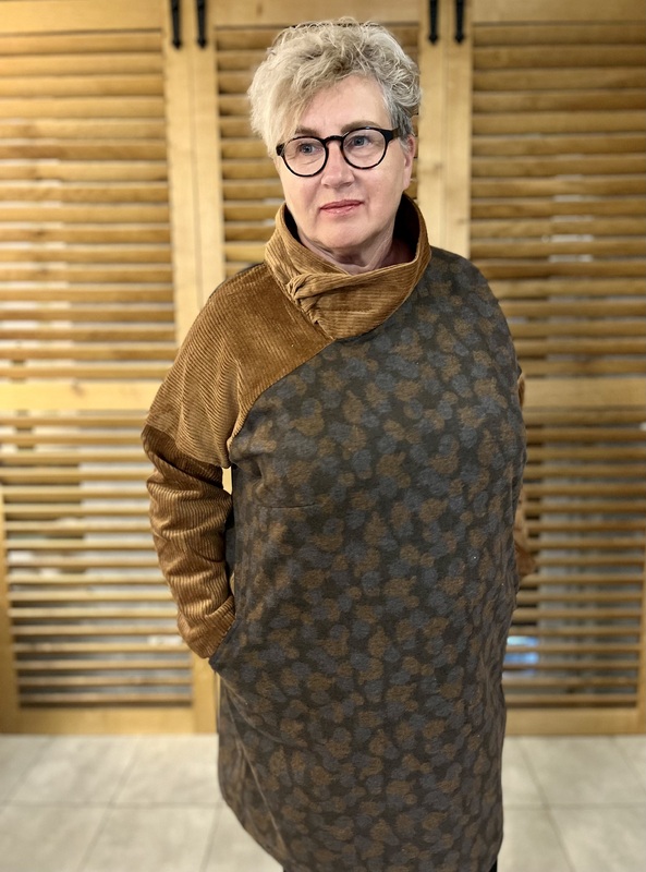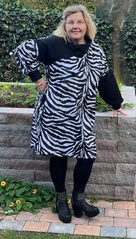 Nähbar ist sie als Kleid, Tunika oder Pulli und- je nach Material- ganzjährig verwendbar.