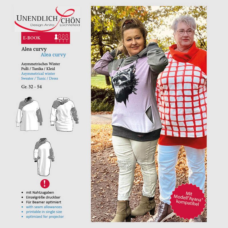 Außerdem ist Alea mit dem Sommerschnitt Ayana CURVY , oder dem ADD ON AYANA kompatibel und mit deren Ausschnittbelegen, Ärmeln und Kapuze erschließen sich weitere tolle Varianten für Sommermodelle.