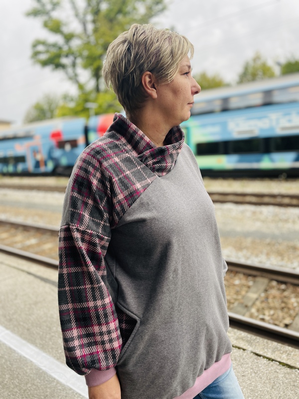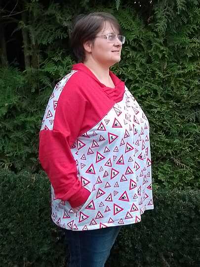 Mit Alea Curvy hast Du ein ausgesprochen vielseitiges Schnittmuster mit asymmetrischer Passe und überschnittener Schulter, wahlweise mit gerafftem Kragen oder kapuze.