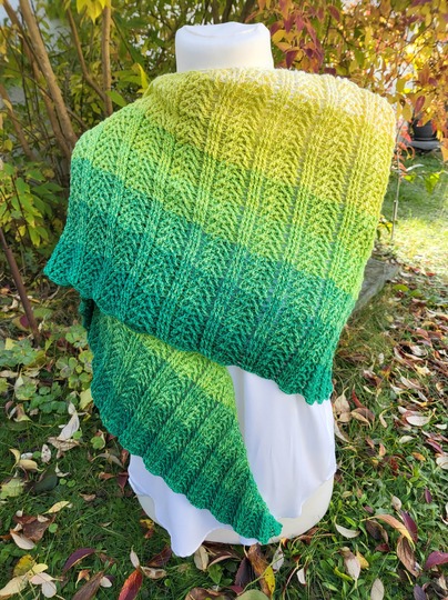 Das Tuch auf dem Titelbild wurde mit 1200 m, 4-fädig und Nadelstärke 3,75 angefertigt und misst ca. 187 x 49 cm.
