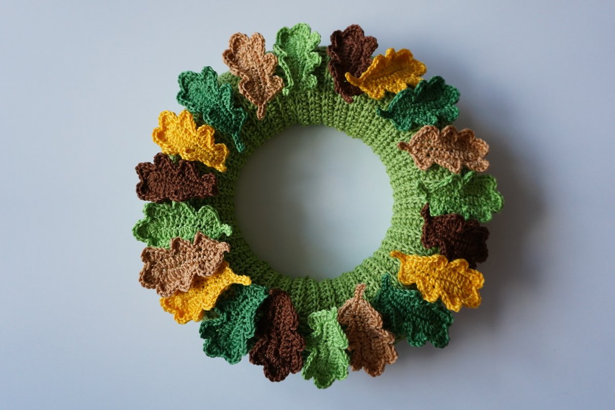 Hübsch dekoriert auf einem gehäkelten Kranz, kann man so die Schönheiten des Herbstes einfangen und zu sich nach Hause holen. Der Kranz kann hängend oder stehend dekoriert werden und ist ein echter Hingucker in der kalten Jahreszeit.