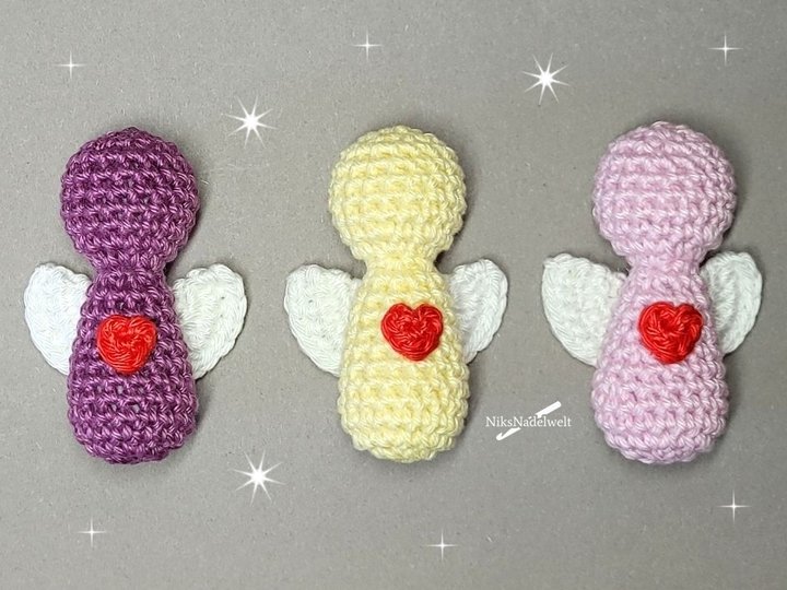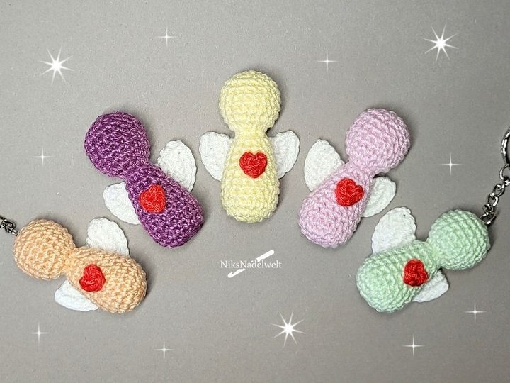 Mit der angegebenen Wolle wird der Schlüsselanhänger Mini Schutzengel etwa 6 cm groß, genau wie der Mini Engel ebenfalls etwa 6 cm groß wird.