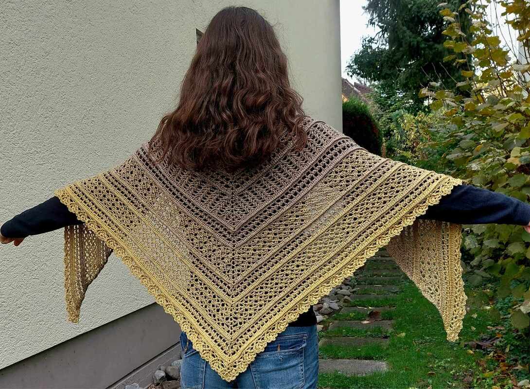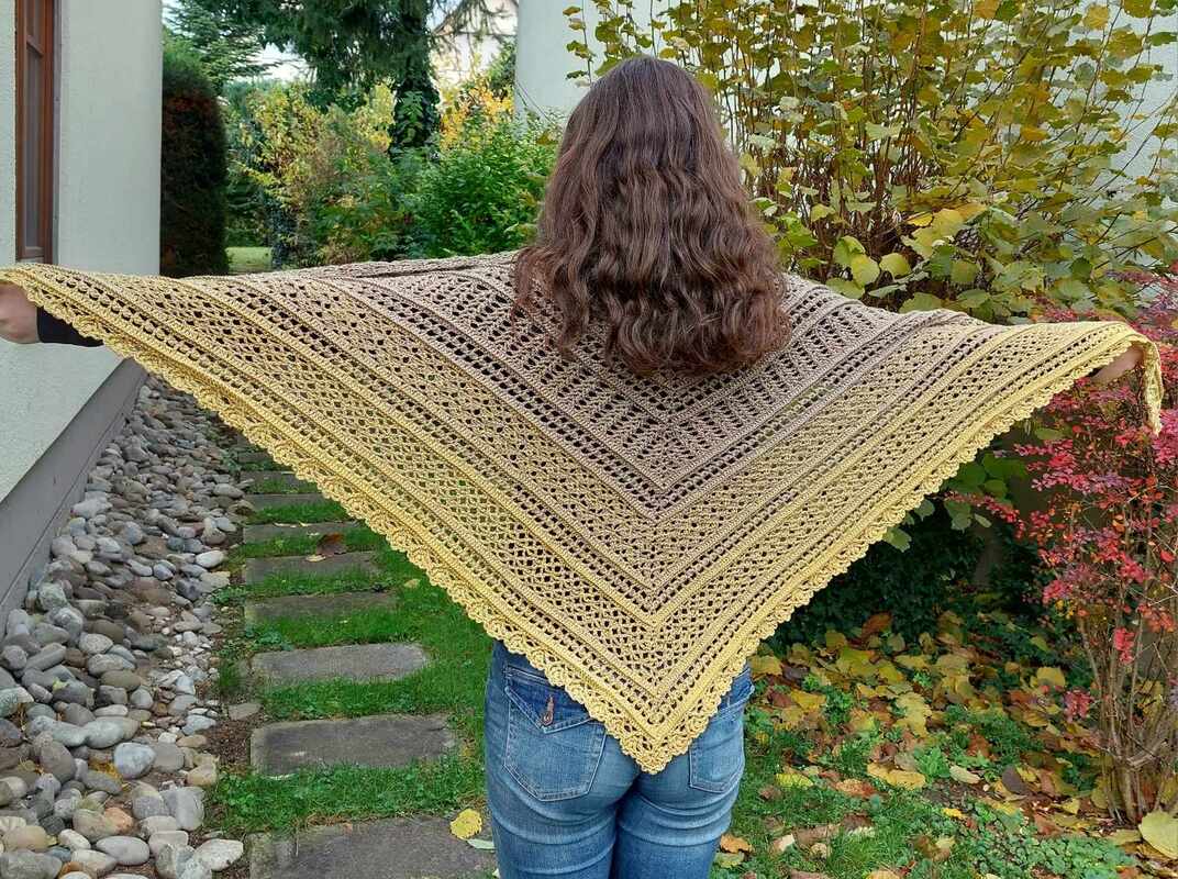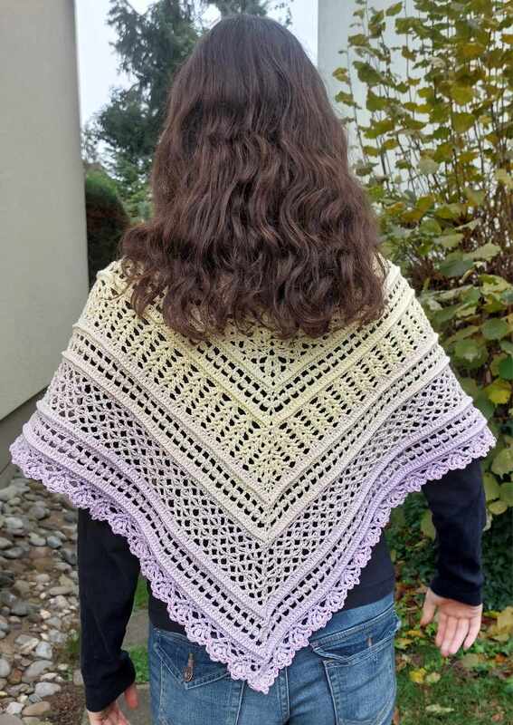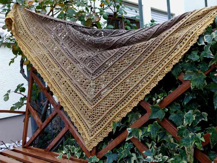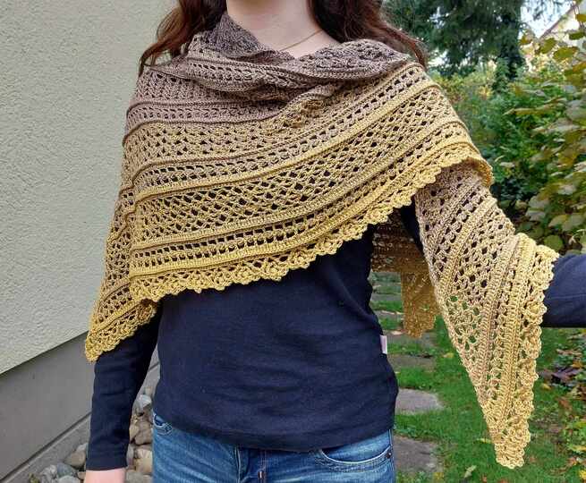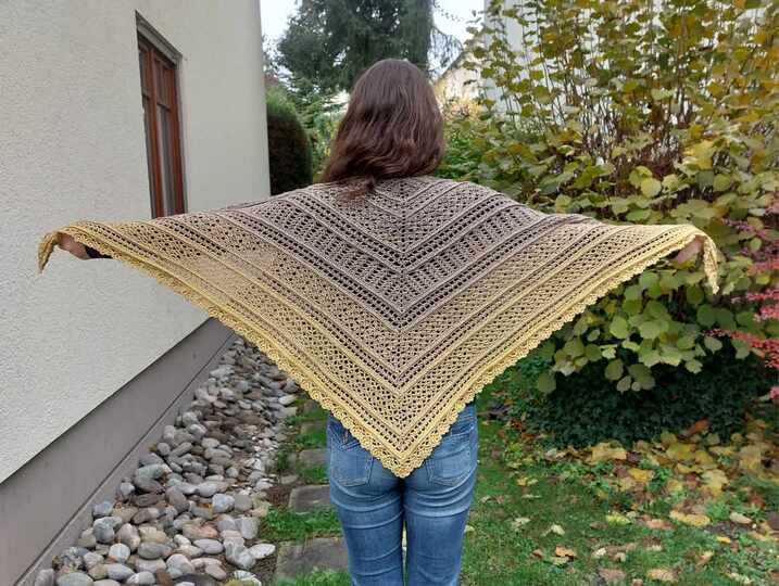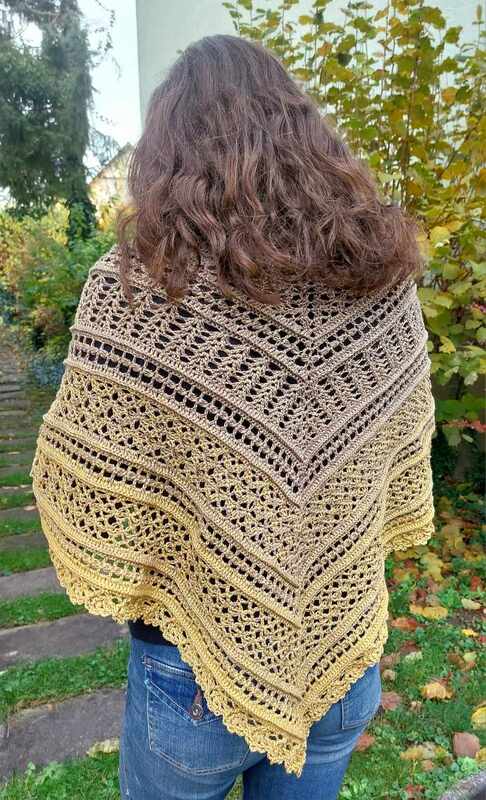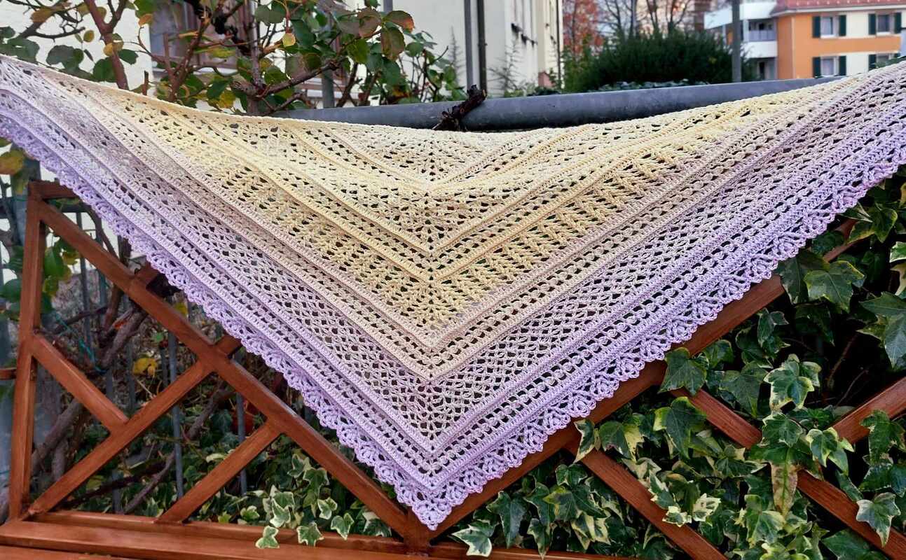 Die (breiten) Mustersätze können beliebig gesetzt werden, sodass man ein Tuch ganz nach eigenem Geschmack häkeln kann.