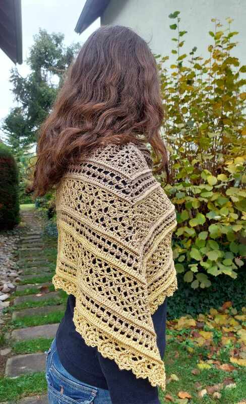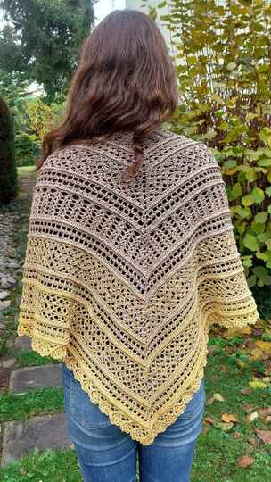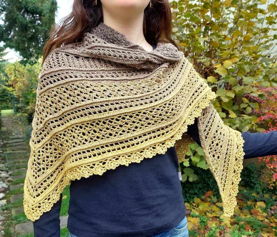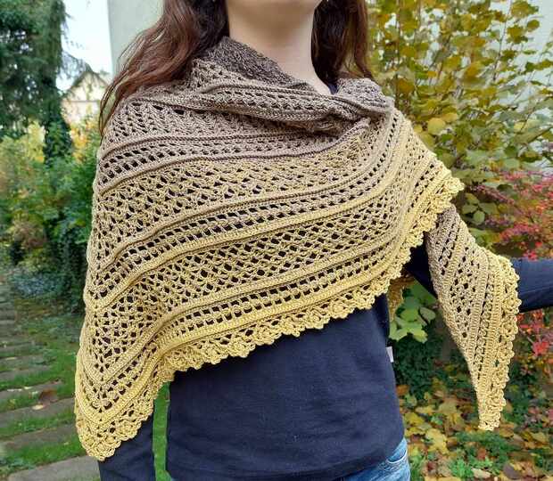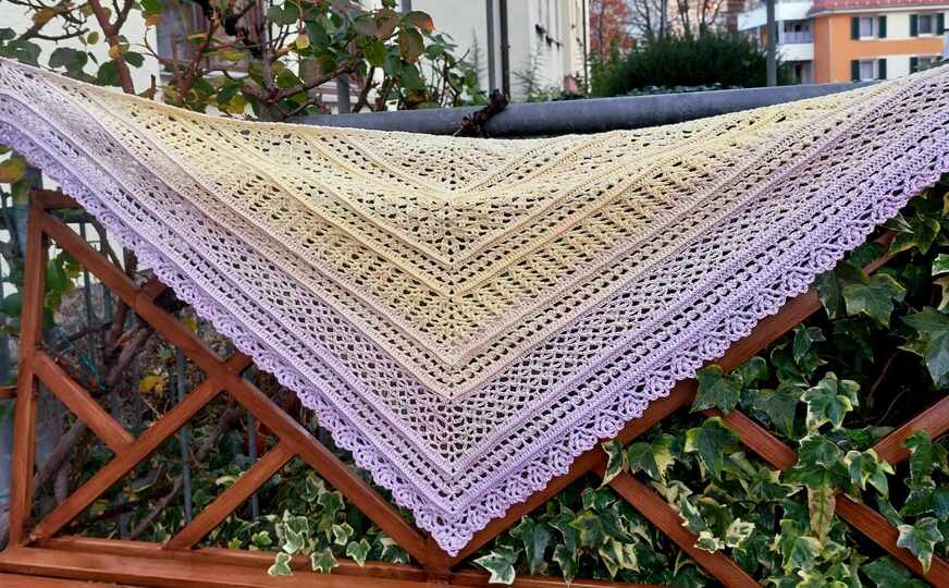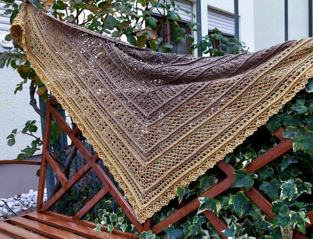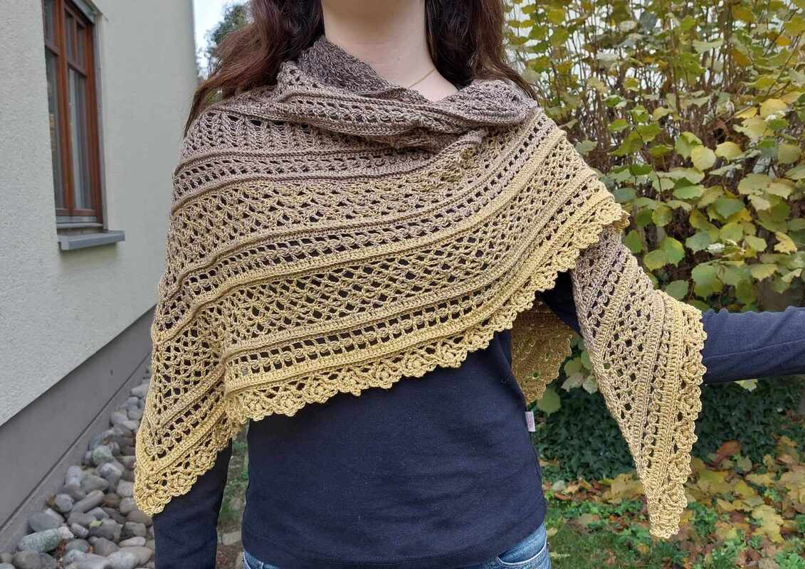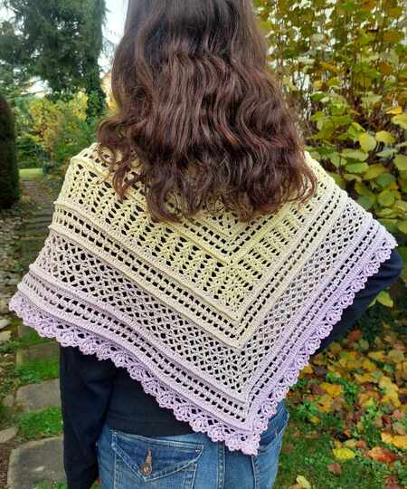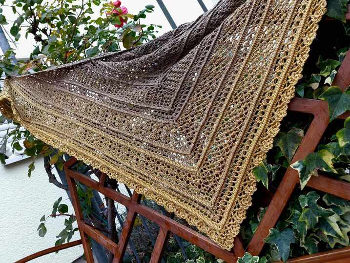 Die (breiten) Mustersätze können beliebig gesetzt werden, sodass man ein Tuch ganz nach eigenem Geschmack häkeln kann.