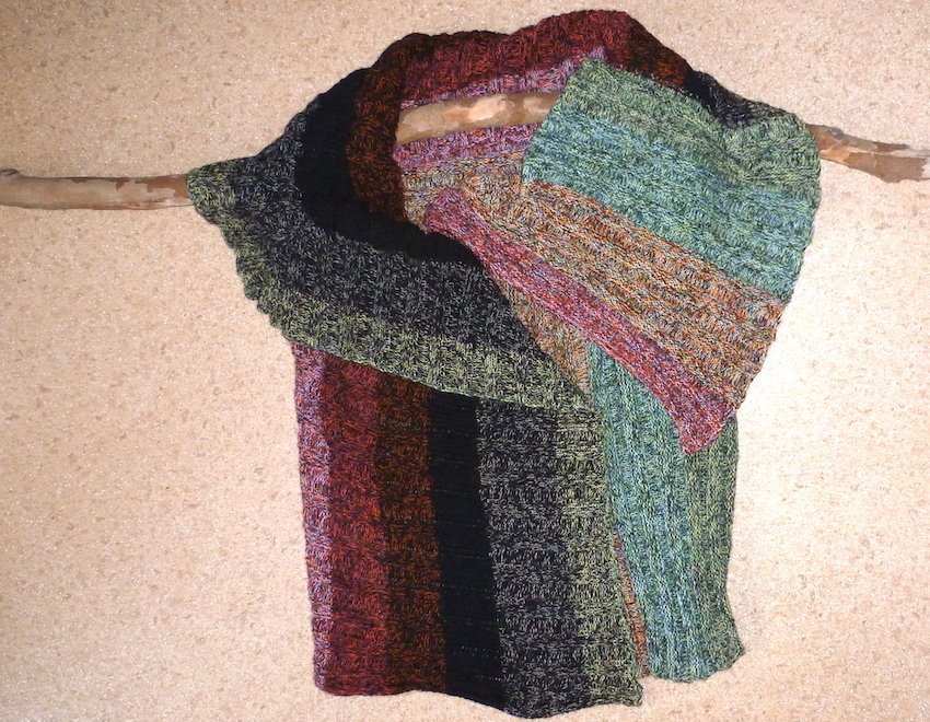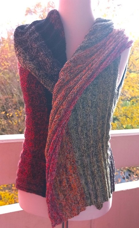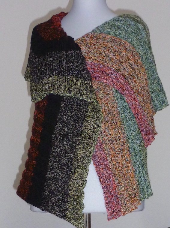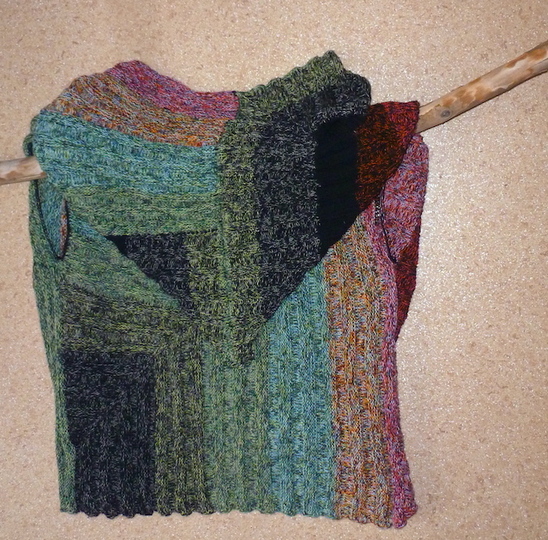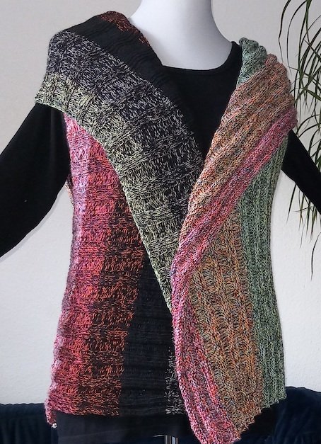 Wie der Name erahnen lässt, ist das Rippenkarree ein Rechteck mit Rippenmuster. Dieses springt schön zusammen, dadurch sitzt es als Weste schön und wärmt prima. Wahlweise kann es aber auch als riesiges Tuch getragen werden.