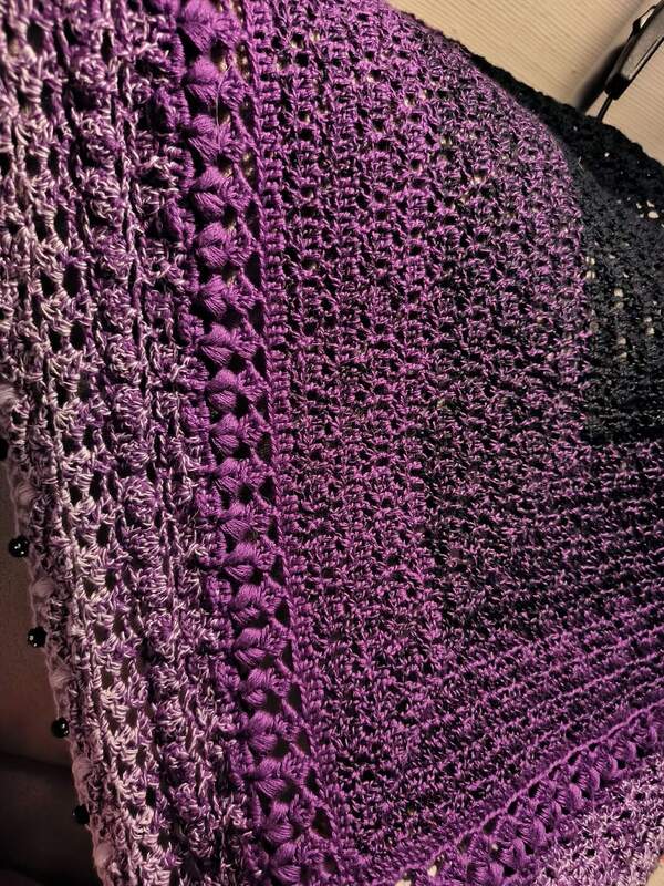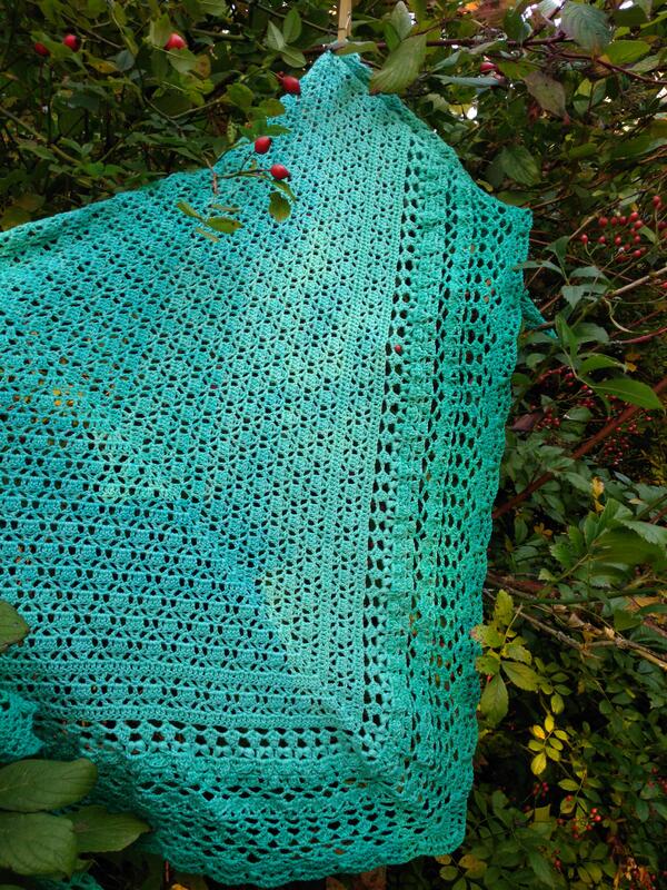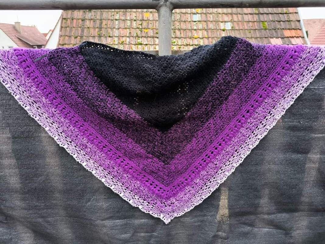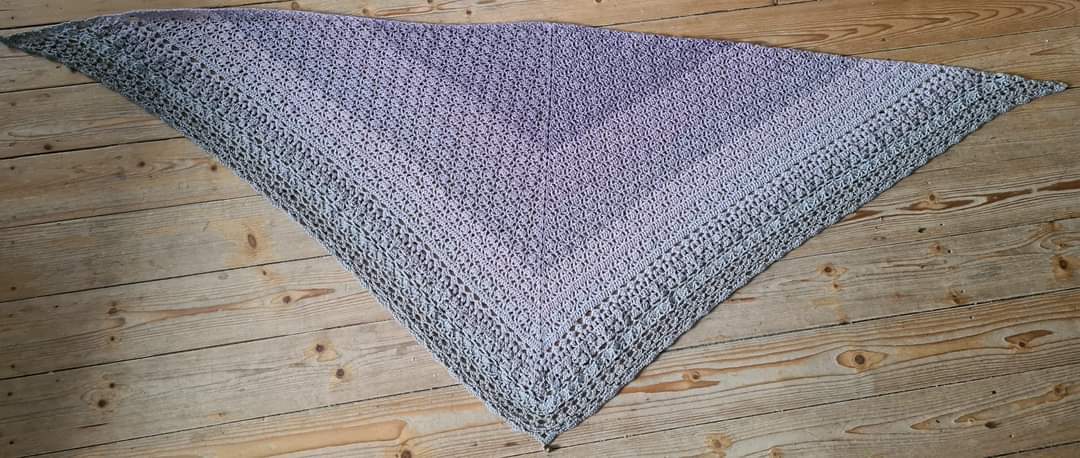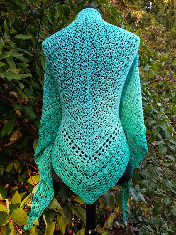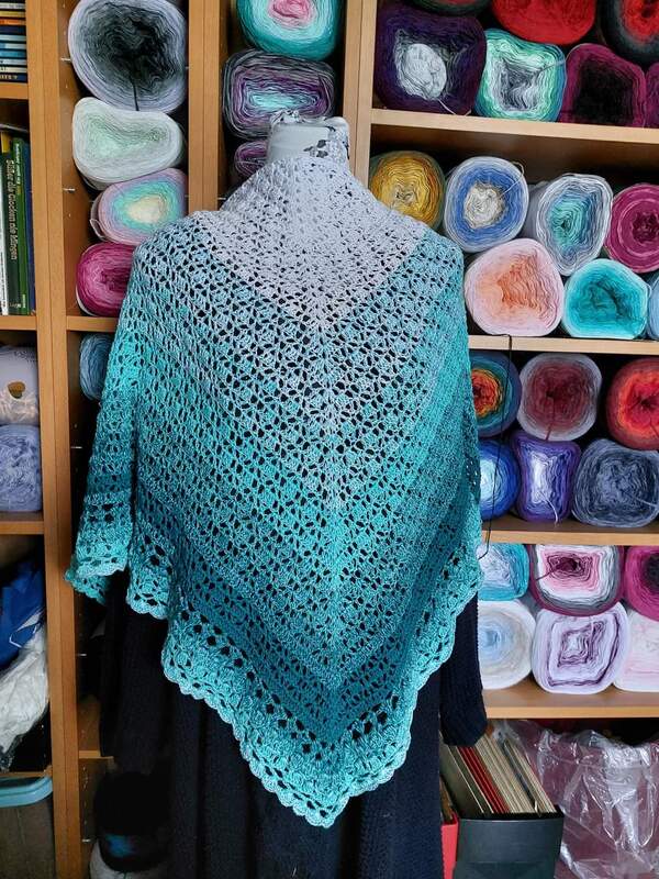 Es kann mit jedem gewünschten Garn gehäkelt werden, ich würde dazu einen Farbverlaufsbobbel mit mindesten 800 m Lauflänge empfehlen. Mein Tuch ist aus dem Bobbel Südsee von Kandelas Handarbeitsbox mit 1000 m 4-fädig und hat die gesamte Borte.