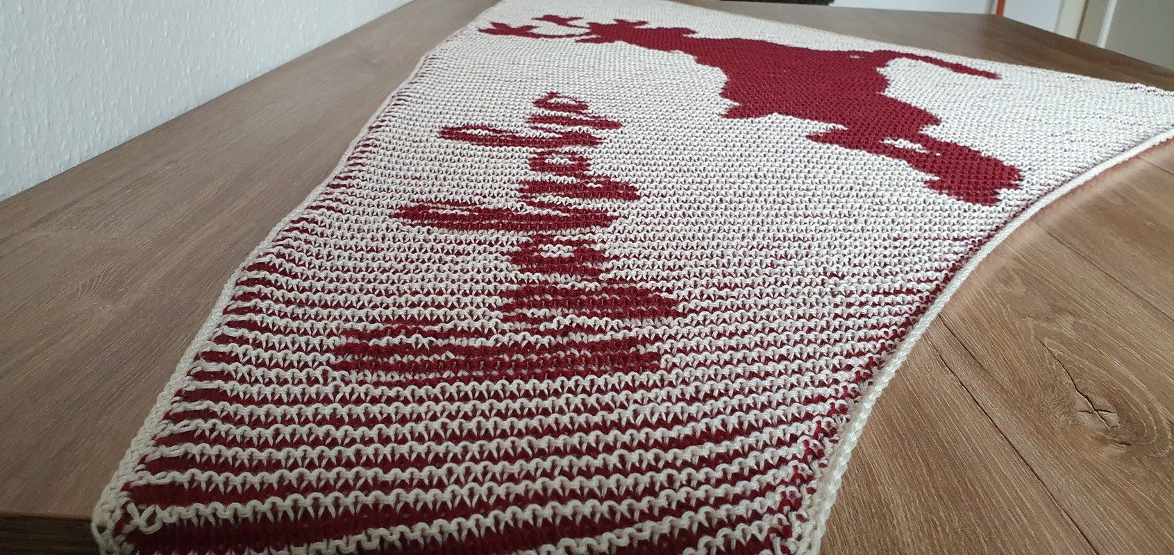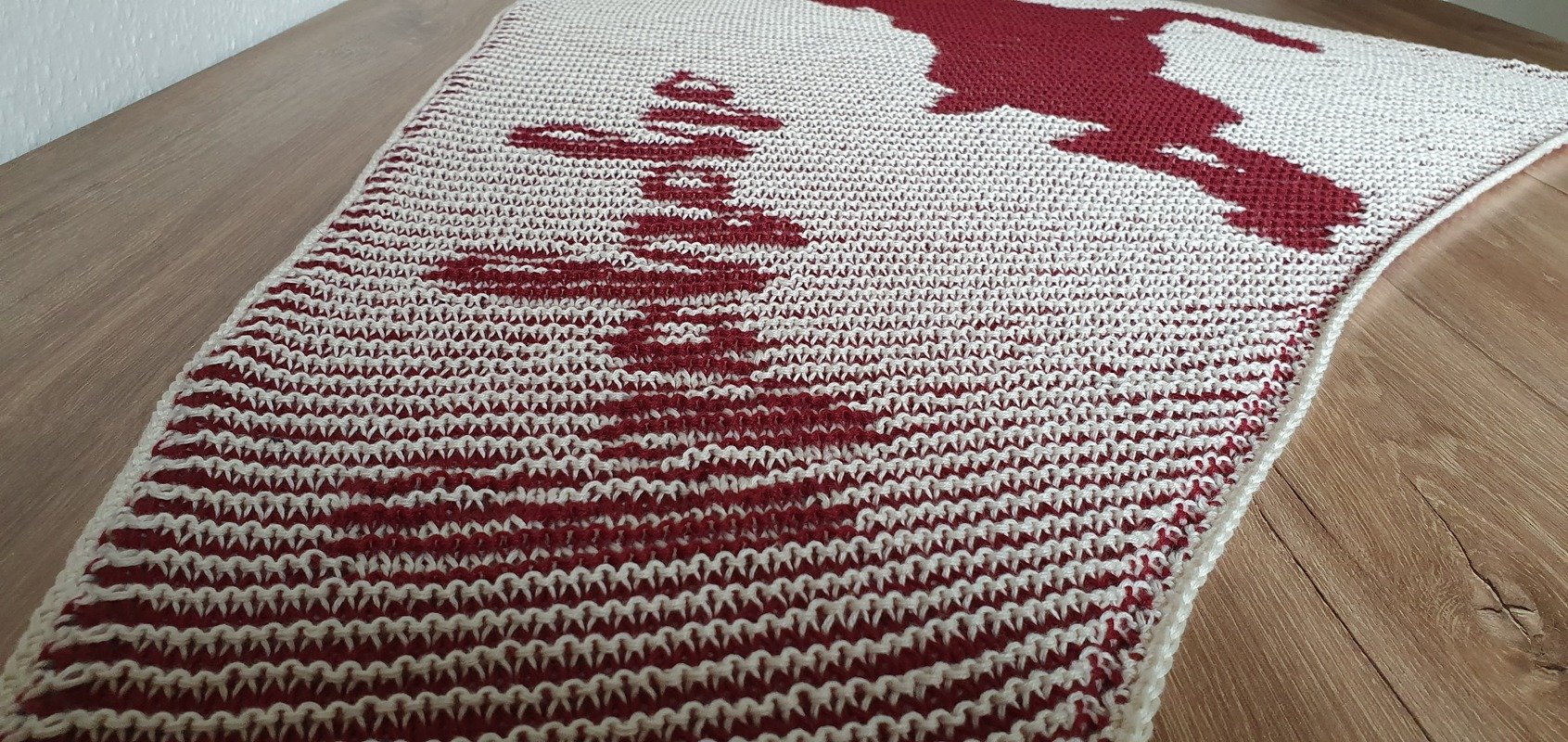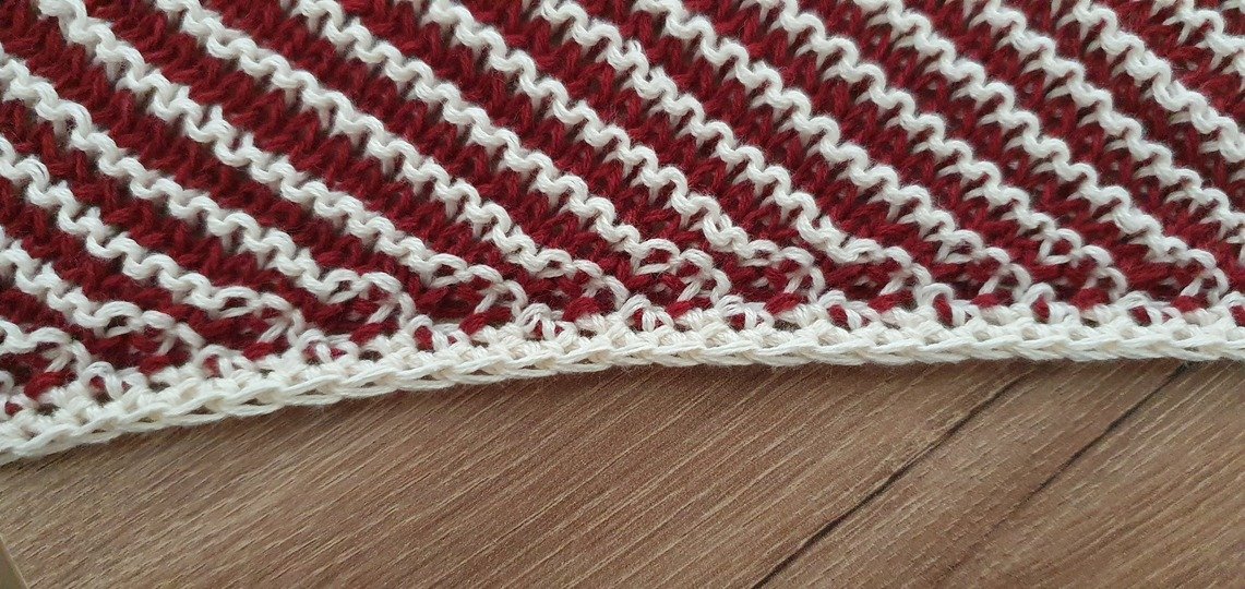Die Borte um das Tuch zu stabilisieren sind in der Anleitung mit festen Maschen gehäkelt. Es wäre von Vorteil, wenn ihr dort auch Grundkenntnisse habt.