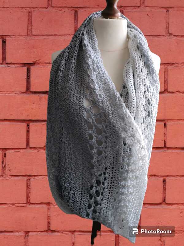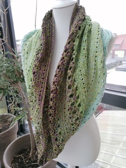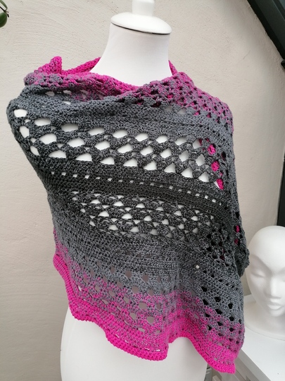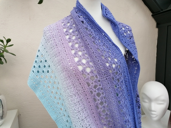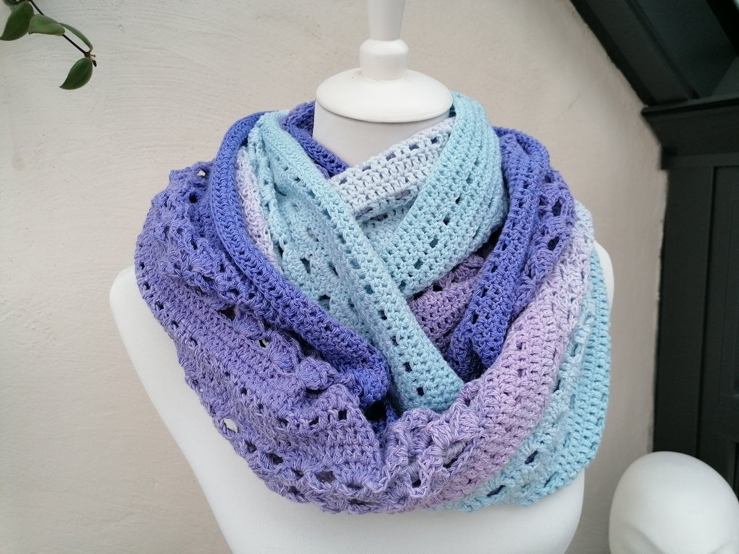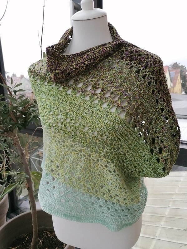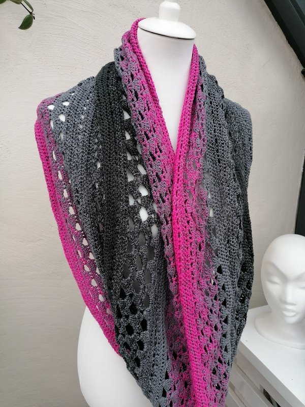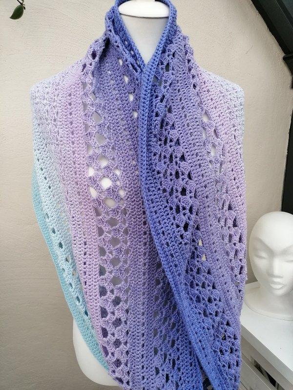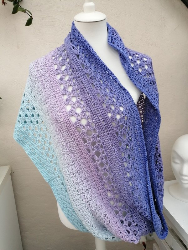 Mit Farbverlaufsgarnen erzielt man bei diesem Tuch wunderbare Effekte, es kann aber jedes beliebige Garn verwendet werden.