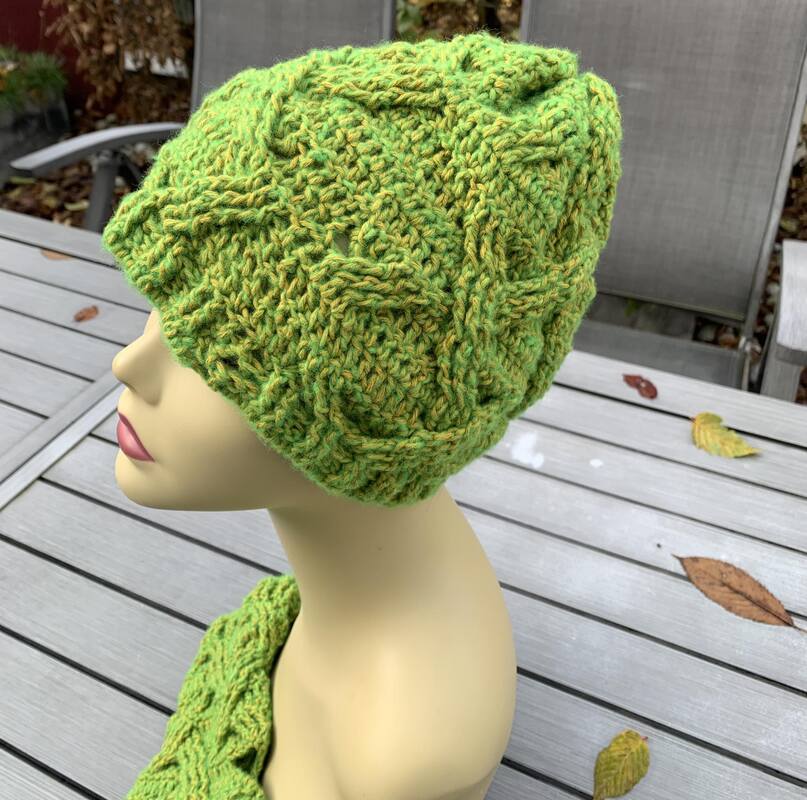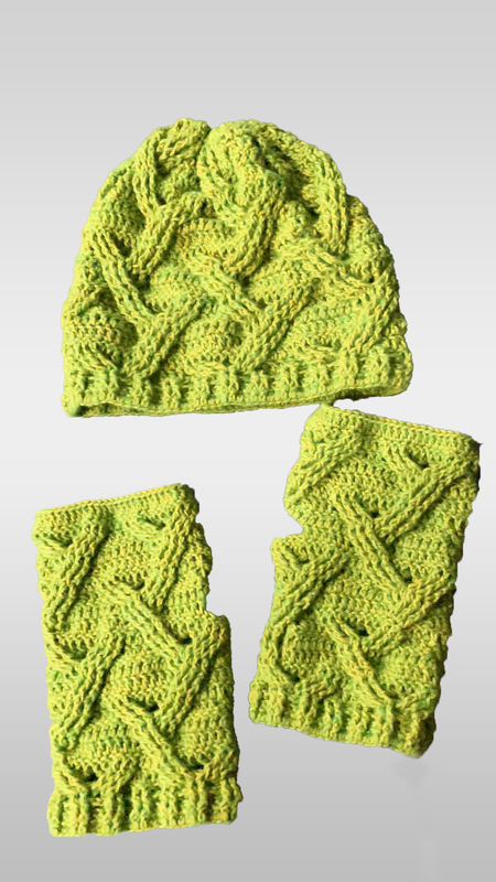 Die Mütze ist für den Kopfumfang von 58cm, die Pulswärmer für einen Umfang von 18cm gearbeitet.