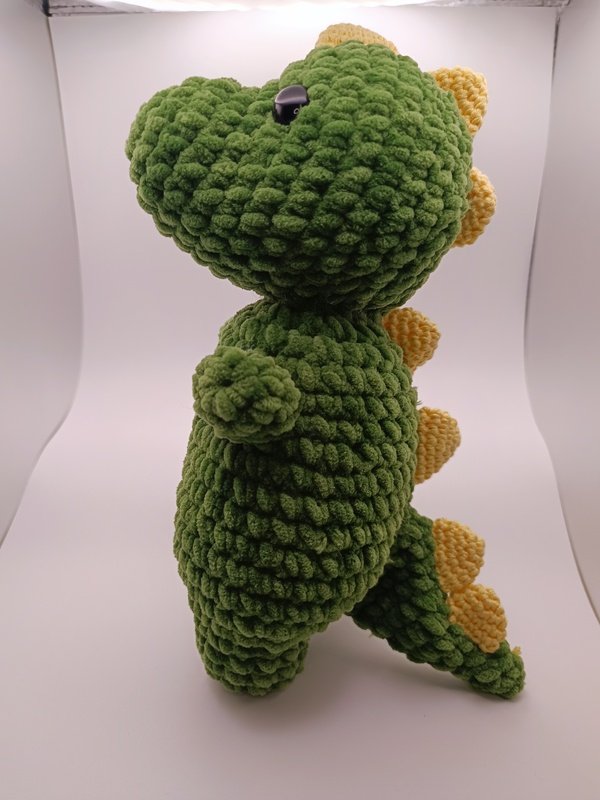 Mit der in der Anleitung verwendeten Wolle wir der Dino ca. 26 cm groß.