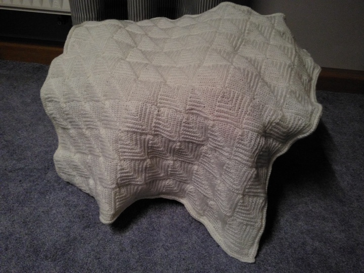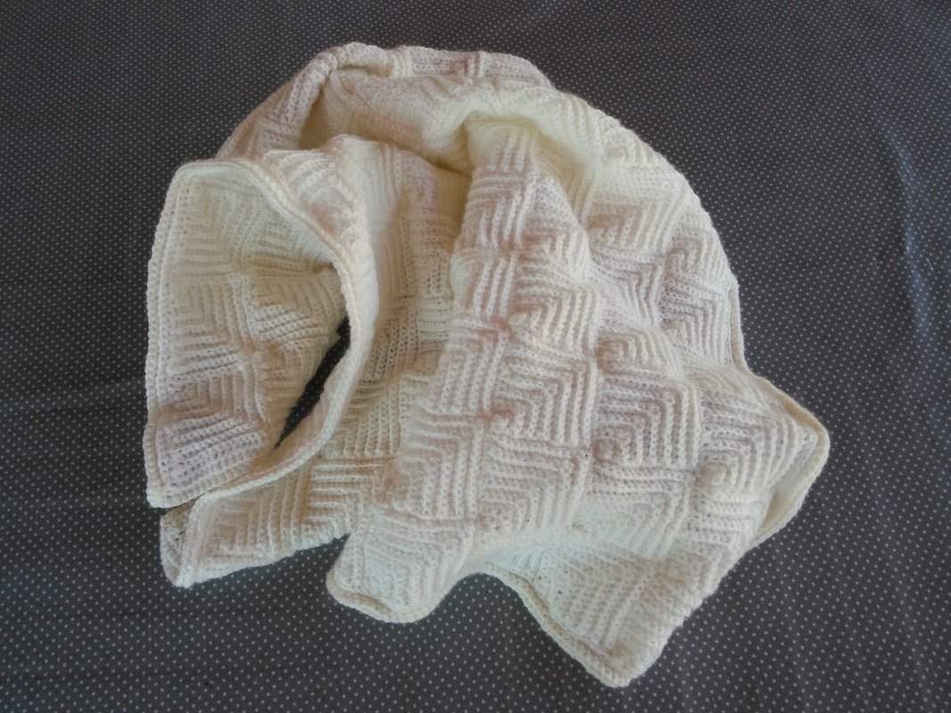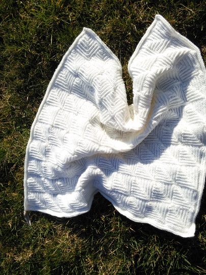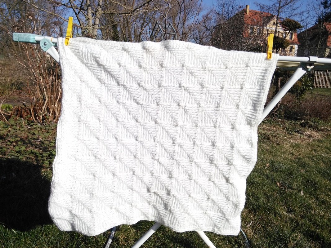 Durch die außergewöhnliche Maschenstruktur ergibt sich ein schönes graphisches Muster, das ein wenig an die Wellen auf schneeverwehten Feldern erinnert. Dennoch ist sie kuschelig warm und das Muster eignet sich sowohl für eine Babydecke als auch für ein größeres Format.