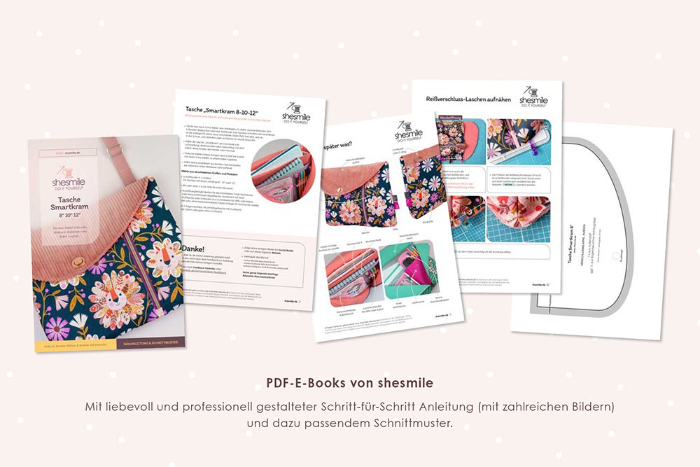 PDF-E-Books von shesmile: Diese leicht verständliche Schritt-für-Schritt-Anleitung mit vielen Fotos ist auch für Nähanfänger geeignet, denn die sehr ausführliche Fotoanleitung begleitet dich bei jedem Schritt.