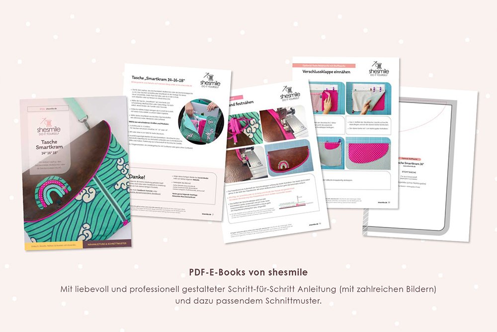 PDF-E-Books von shesmile: Diese leicht verständliche Schritt-für-Schritt-Anleitung mit vielen Fotos ist auch für Nähanfänger geeignet, denn die sehr ausführliche Fotoanleitung begleitet dich bei jedem Schritt.