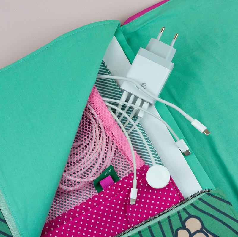 Ausstattungsmöglichkeiten für das Innenleben: Mit fester Netztasche oder herausnehmbare Kabeltasche. Kombiniert mit einer Stofftasche oder Schlaufen aus Gummiband. Mit oder ohne herausnehmbarer Polster-Einlage für technische Geräte.