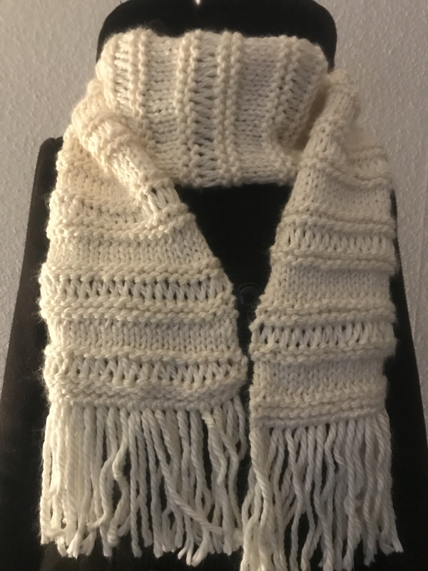 Der fertige Schal ist 2,10m lang. Kann aber nach belieben länger gearbeitet werden.