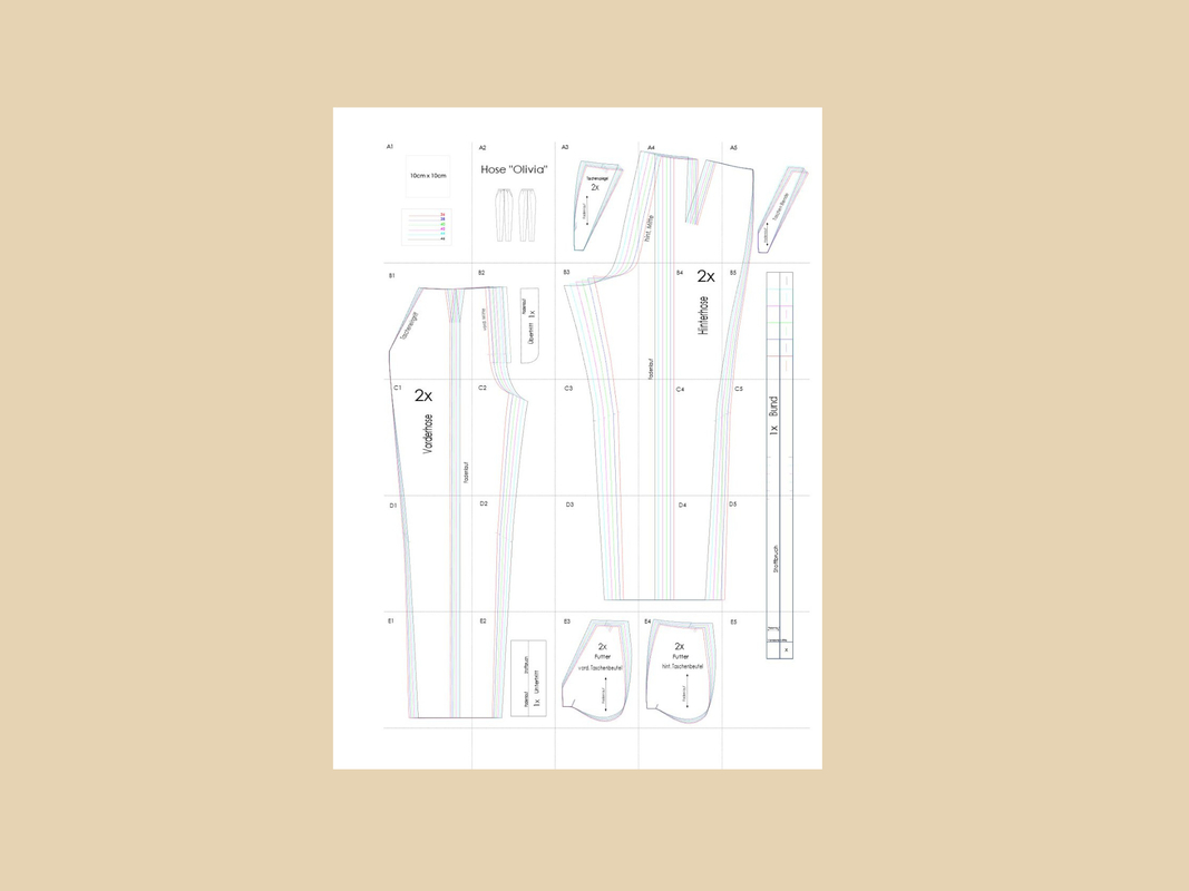 Das Schnittmuster des Hosenmodells ist als PDF-Datei im A4-Format erhältlich. Es umfasst die Größen 36 bis 46, so dass Sie die Hose passgenau auf Ihre individuellen Maße zuschneiden können.