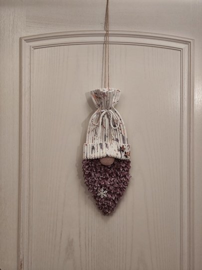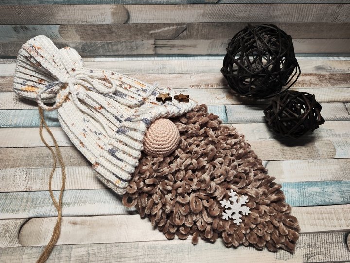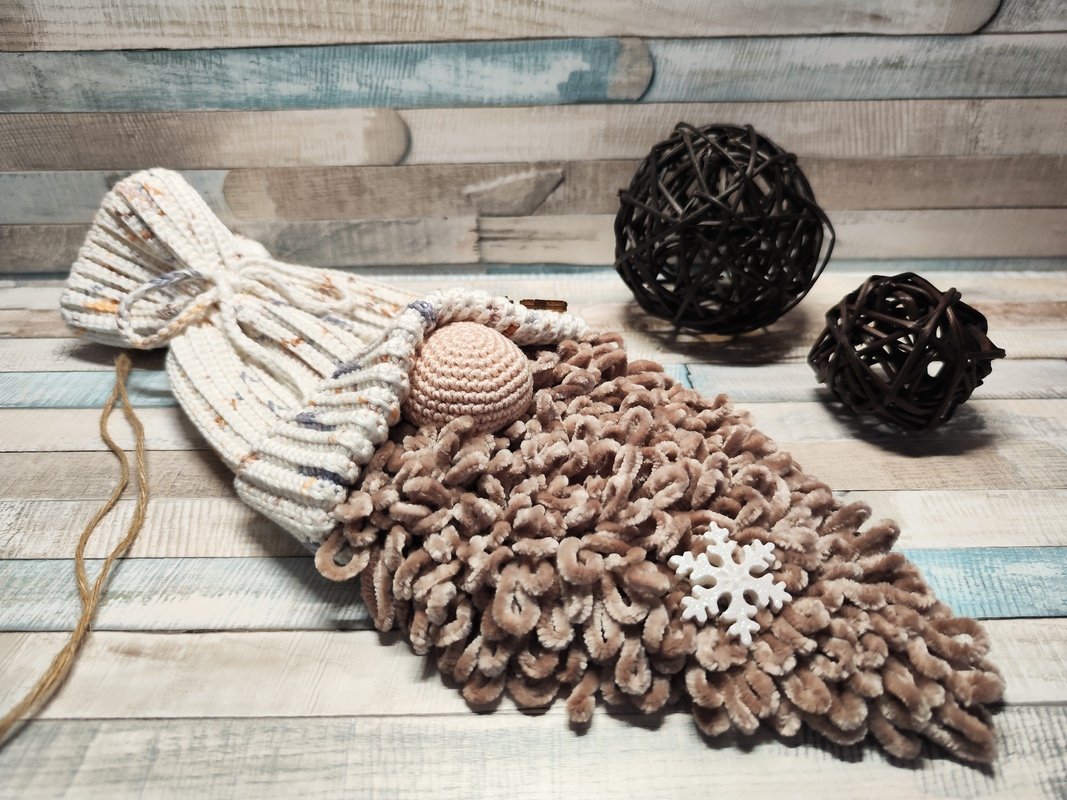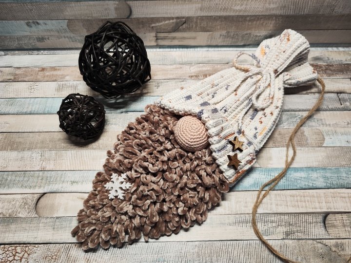 Der Mützenwichtel wurde mit Baumwollgarn (50g-105m) und einer 3,0 Nadel gehäkelt.