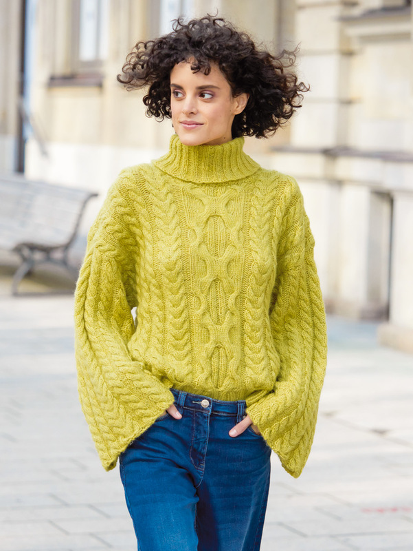 Plastische Zopfmuster zieren diesen tollen Pullover. Die gerade und weit geschnittenen Ärmel fallen extrem lässig und geben einen unglaublichen Tragekomfort. Durch den geraden Schnitt kann man sich wunderbar auf das schöne ausdrucksstarke Zopfmuster konzentrieren und brauche nicht auf Abnahmen zu achten. Der Rollkragen wird angestrickt, wenn alle anderen Teile schon fertig gestrickt und zusammengenäht sind. Er wird dann einmal umgeklappt und hält wirklich bei jedem Wetter kuschelig warm. Gestrickt wird mit einer tollen Wolle von LANA GROSSA in Größe 36/38, 40 oder 42/44. DetaillierteStrickschrift und Schnitt machen das Nachstricken zum Kinderspiel
