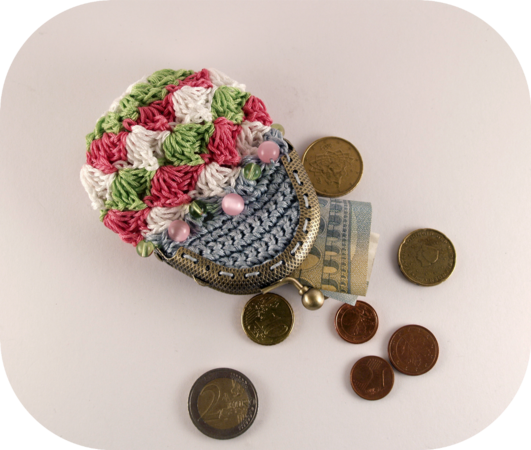 Anleitung für eine Geldbörse mit Klippverschluss - gut geeignet als Schlüsselanhänger oder Taschenbaumler. In 4 leuchtenten Farben gehäkelt und mit farbigen Glasperlen geschmückt, ist sie ein besonderes Accessoire für jeden Tag.