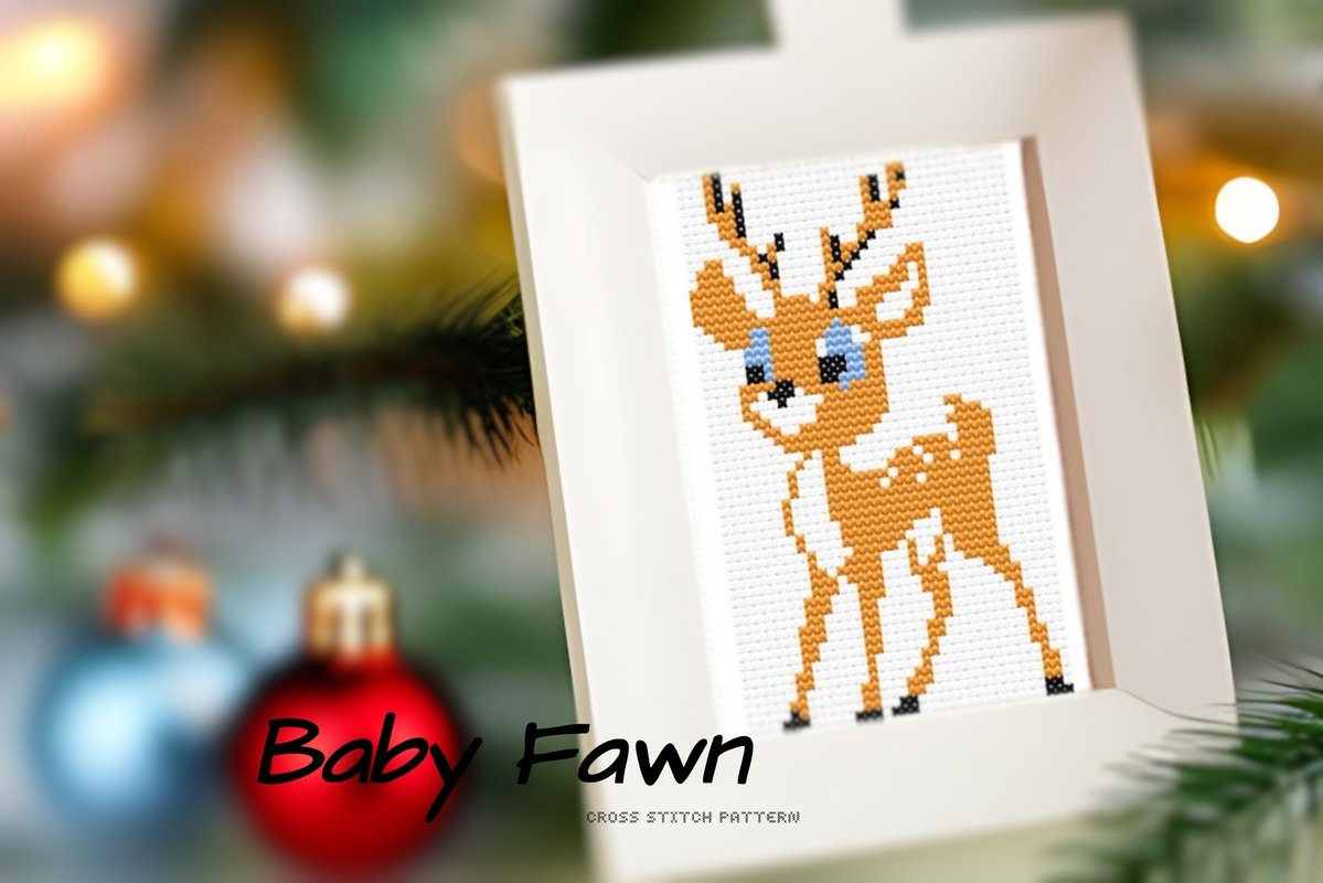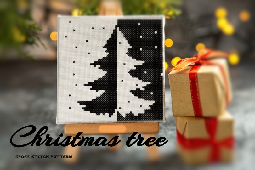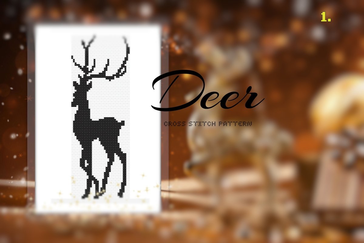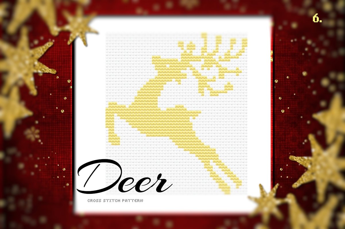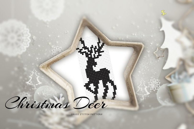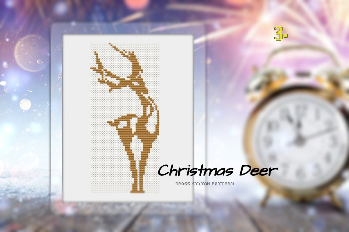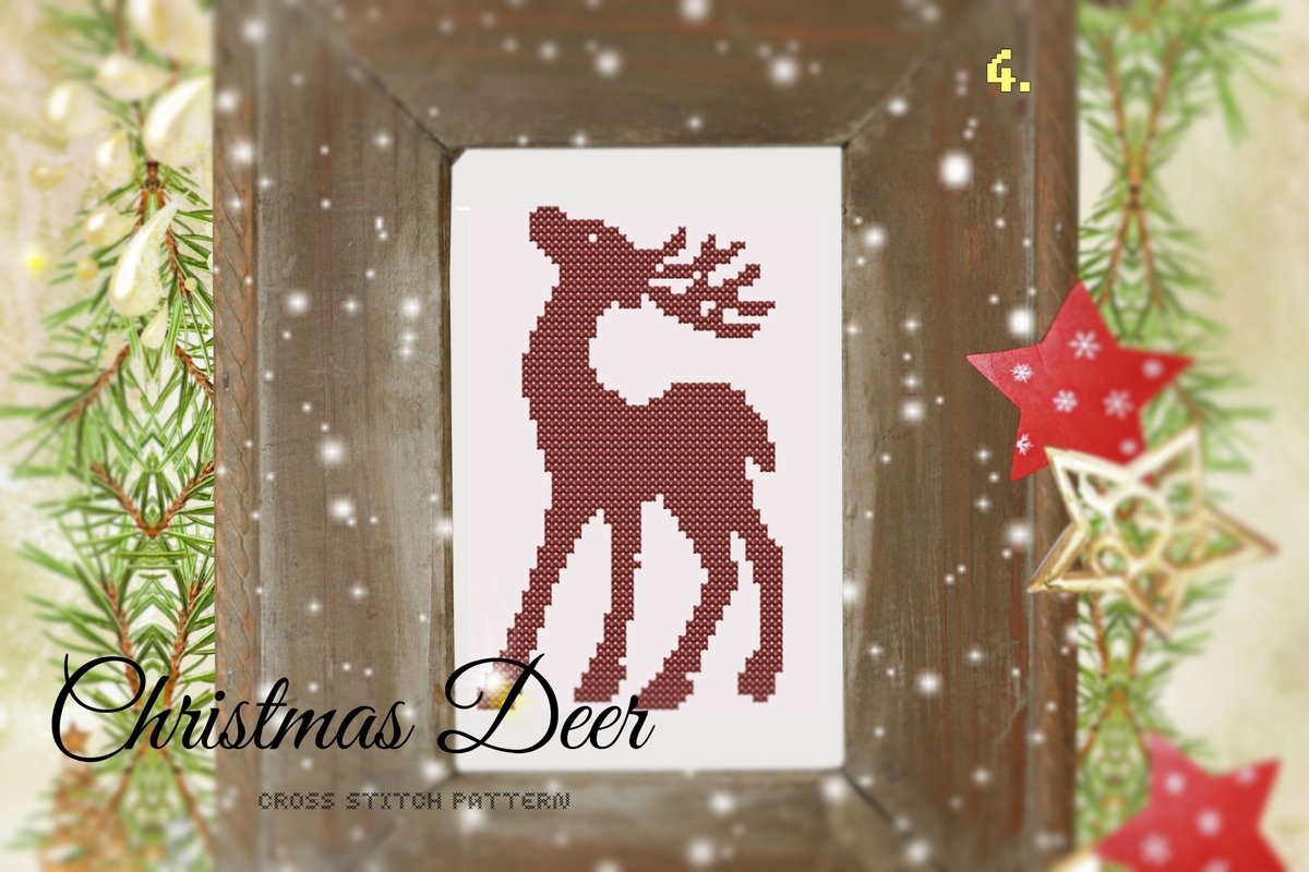Weihnachtsmotiv-Kreuzstich. Weihnachtshirsche, Weihnachtsbaum und Schneeflocken.
