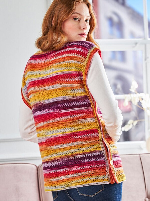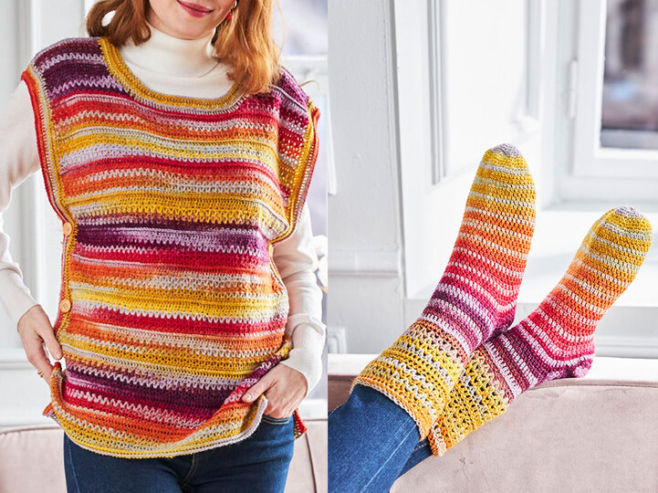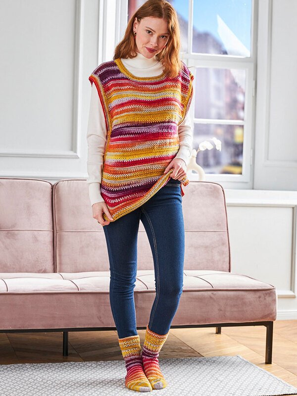 Das Besondere an diesem Set ist der tolle Farbverlauf. Dieser Farbverlauf sorgt für einen einzigartigen Look und macht das Set aus Pullunder und Socken zu einem echten Highlight. Die fröhliche Sonnenfarbe verleiht dem Set einen witzigen Effekt.