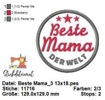 Diese Stickdatei zeigt den Schriftzug "Beste Mama der Welt" in einer schönen Schriftart, geschmückt mit kleinen Blumen-Emojis, die die Liebe und Zuneigung symbolisieren. Das Design ist perfekt, um deiner Mama zu zeigen, wie besonders sie für dich ist.