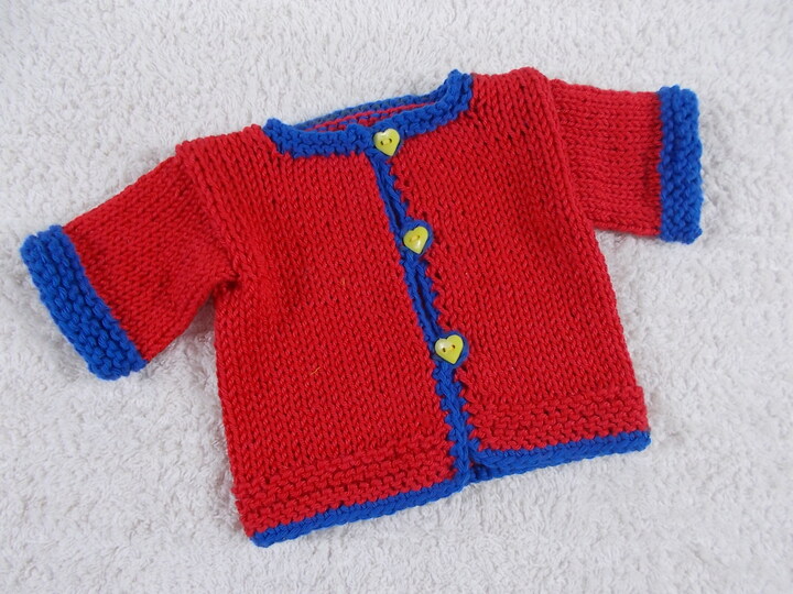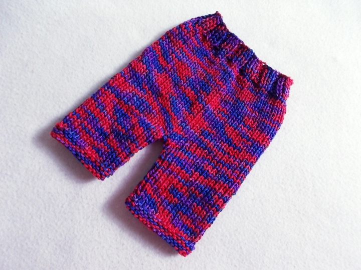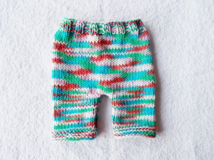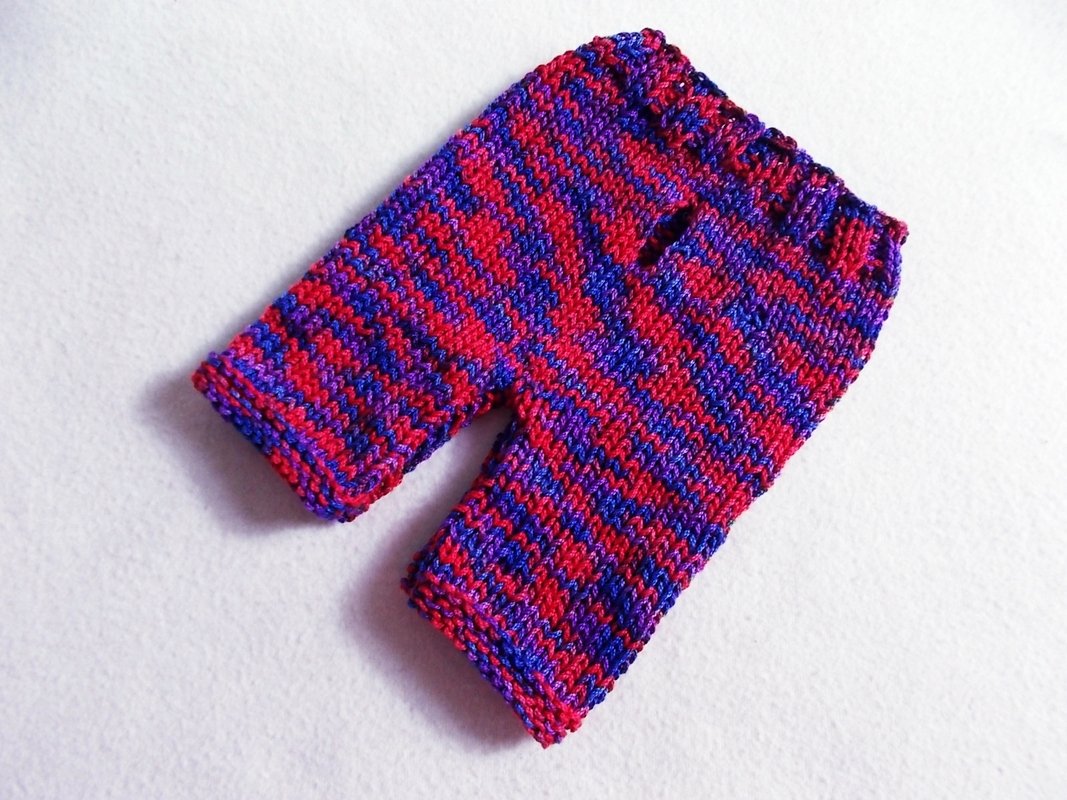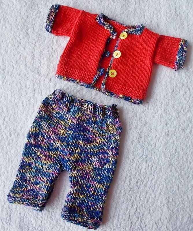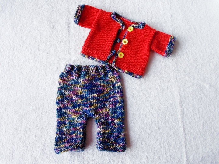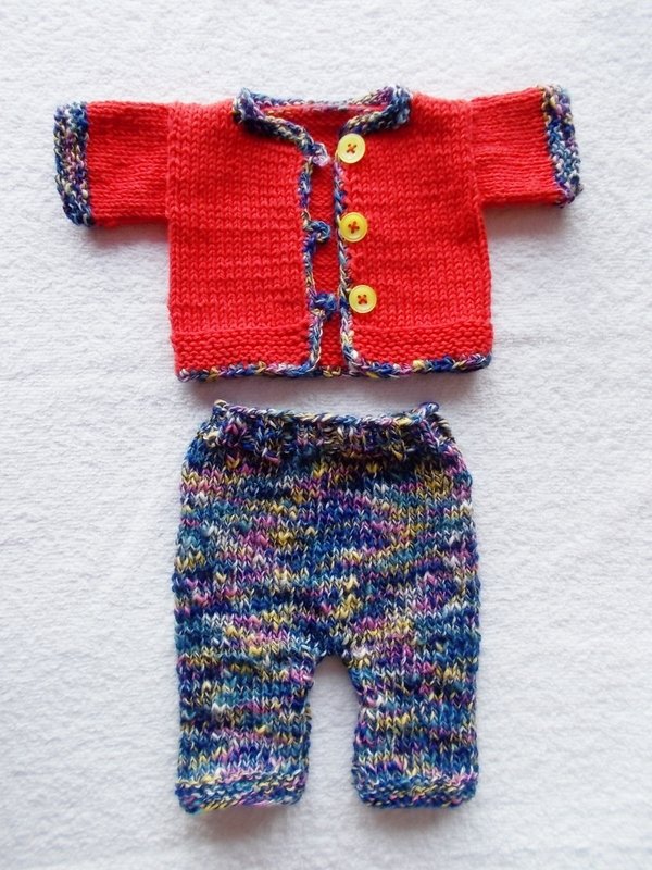 Natürlich passt die Kleidung auch Puppen, dann wird die Hose einfach ohne Loch gestrickt.